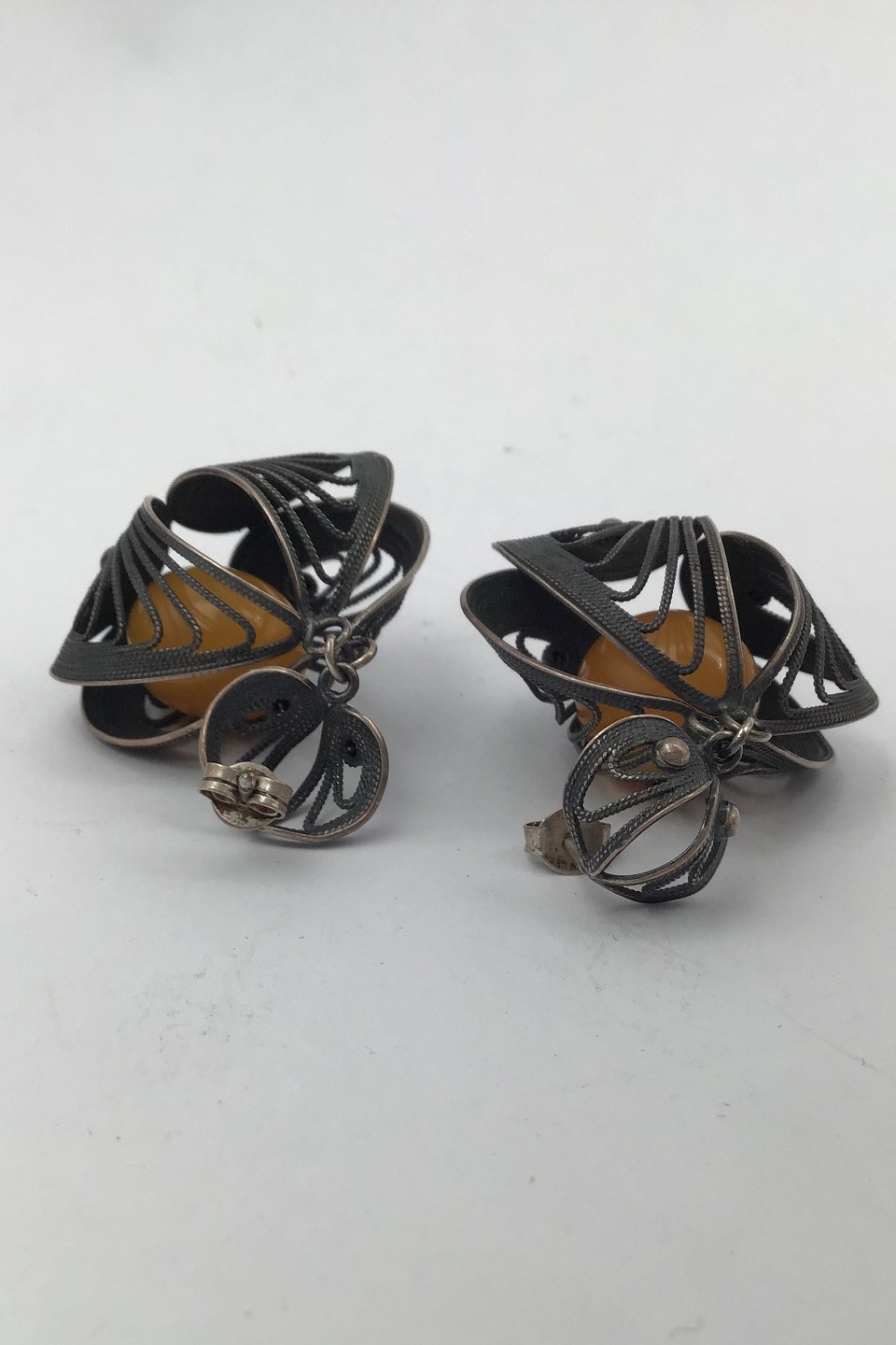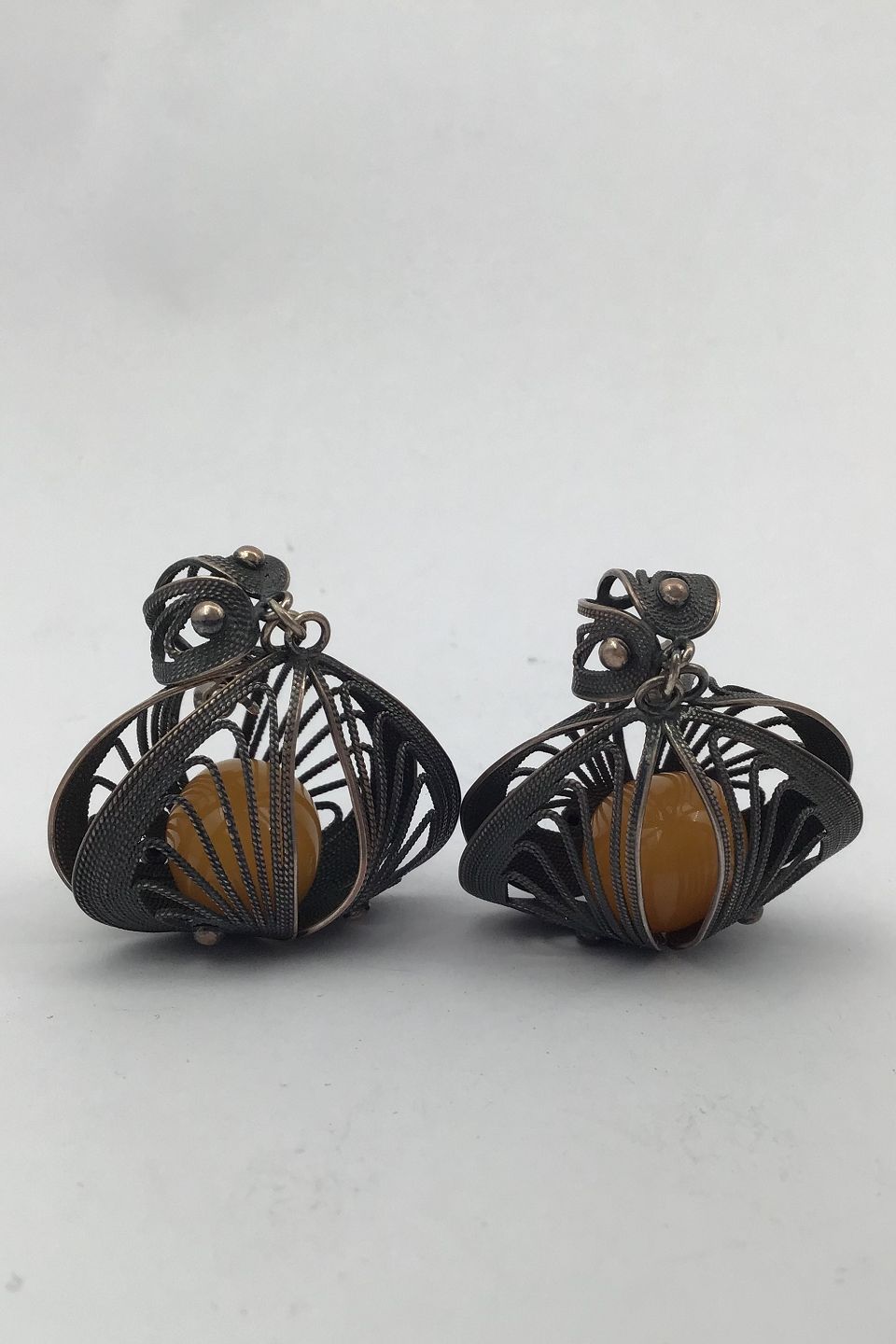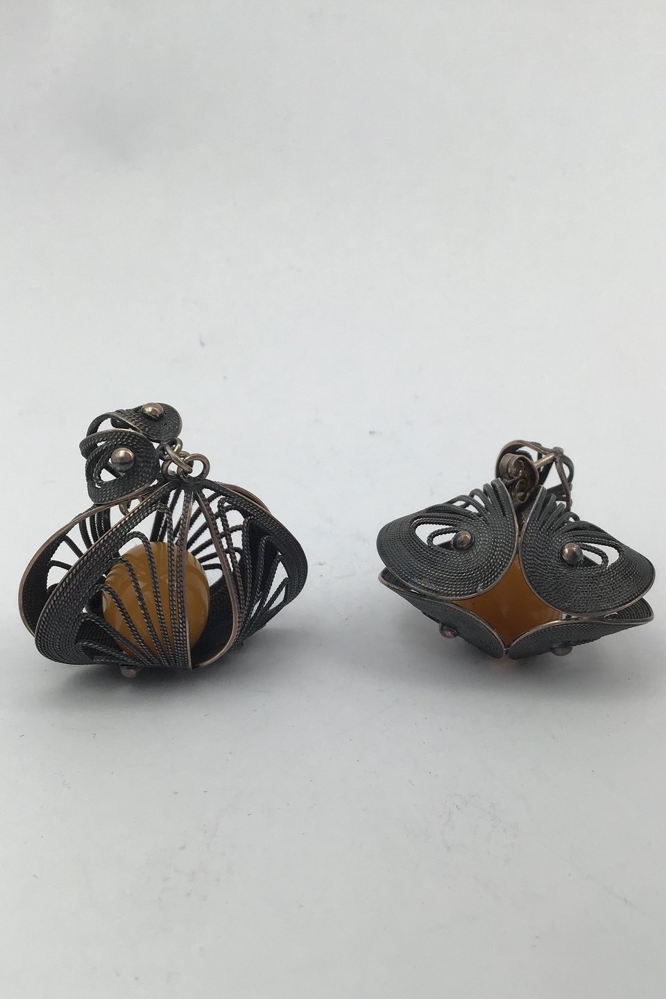 Filigree Silver Earrings (studs) with Amber Measures 4.2 cm x 3.3 cm (1.65 inch x 1.30 inch) Combined Weight 15.7 gr / 0.55 oz (Not hallmarked)
