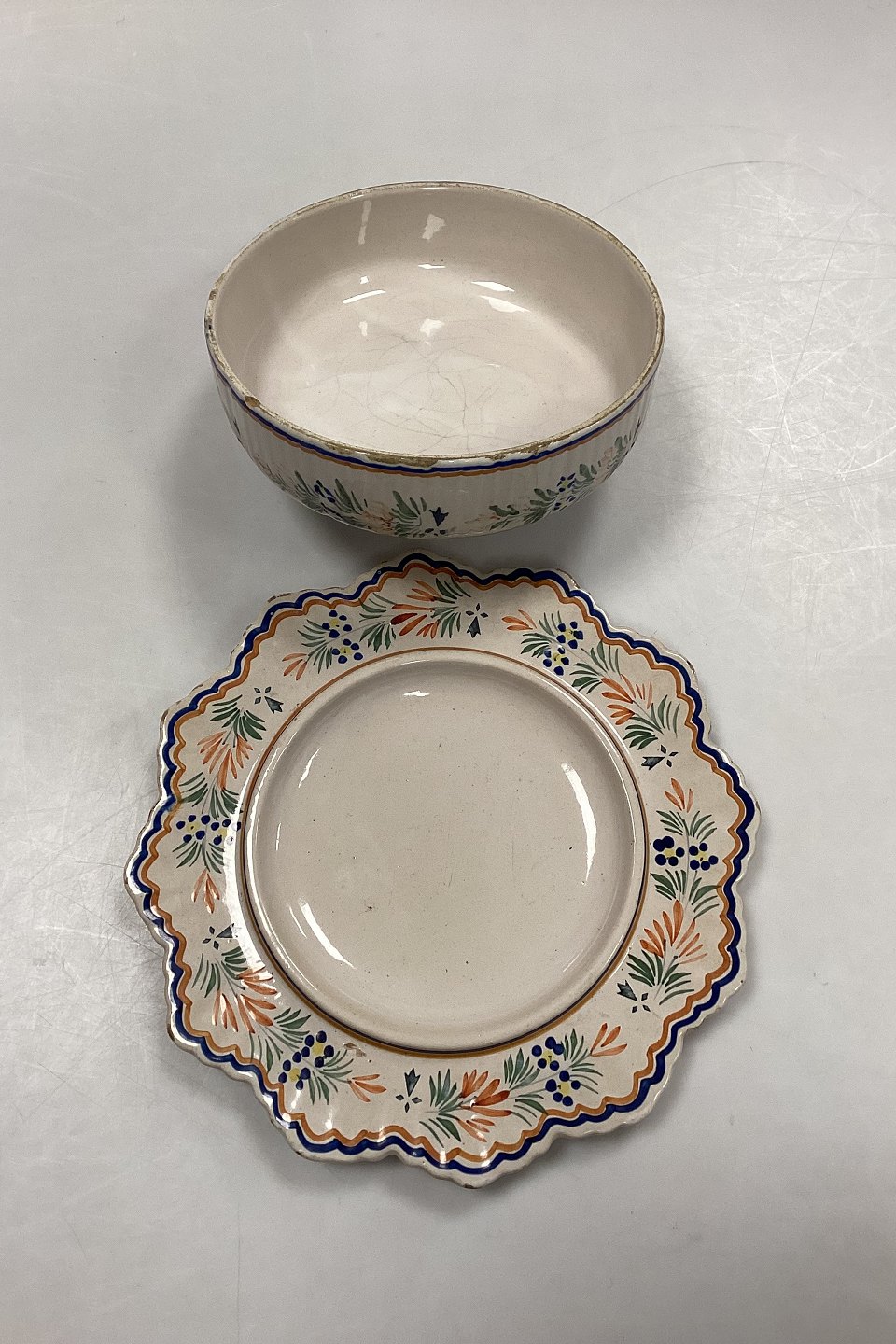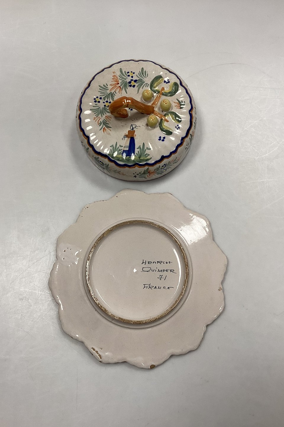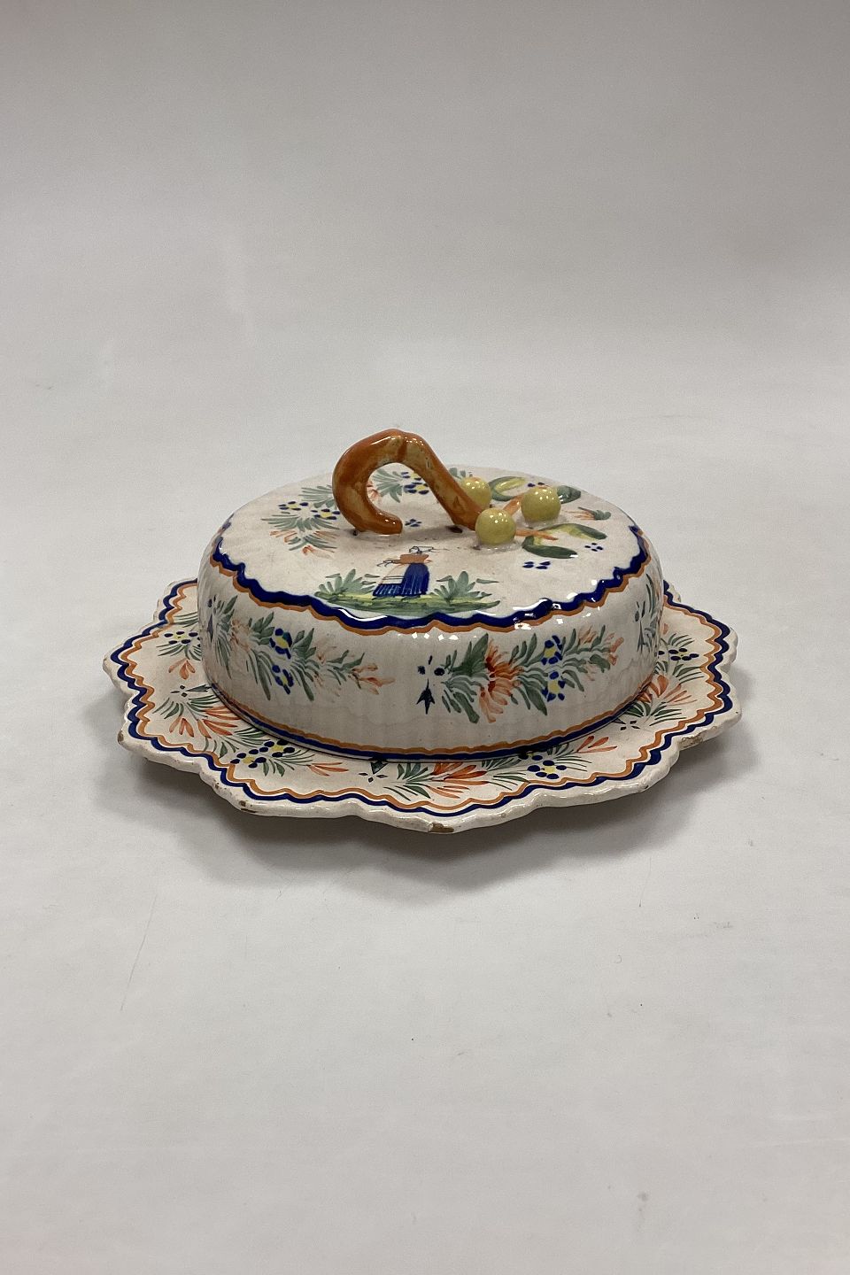 Henriot Quimper Faience 71 Cheese Bell. Motif with flowers and Breton woman. There are small chips in the glaze.