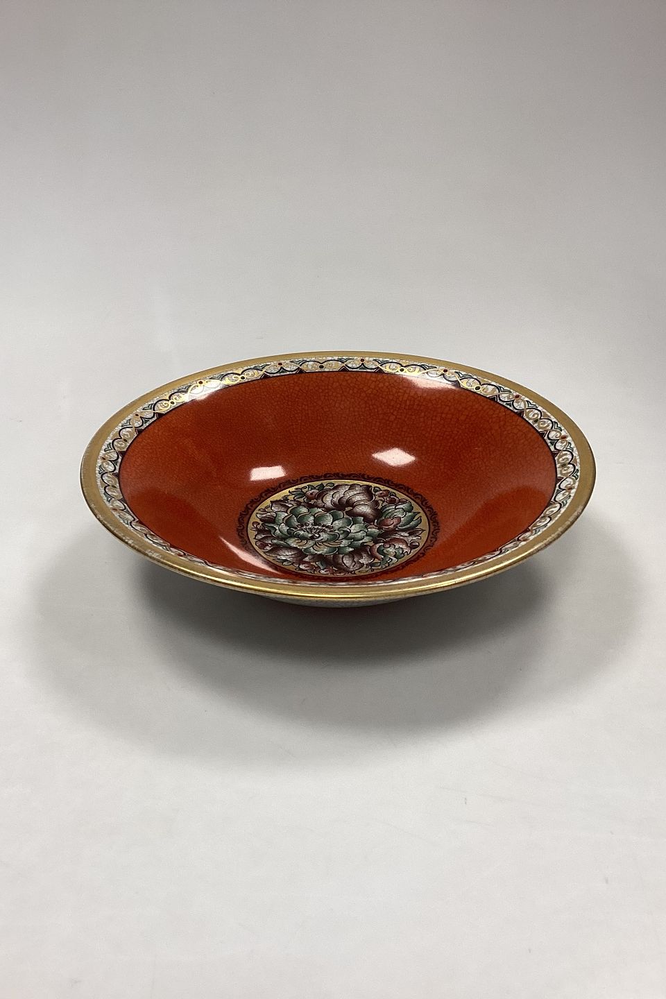 Dahl Jensen Craquelé Skål No. 142/644. Dekoration i siena rød, grøn, hvid og guld. Lettere slid på guldkanten.