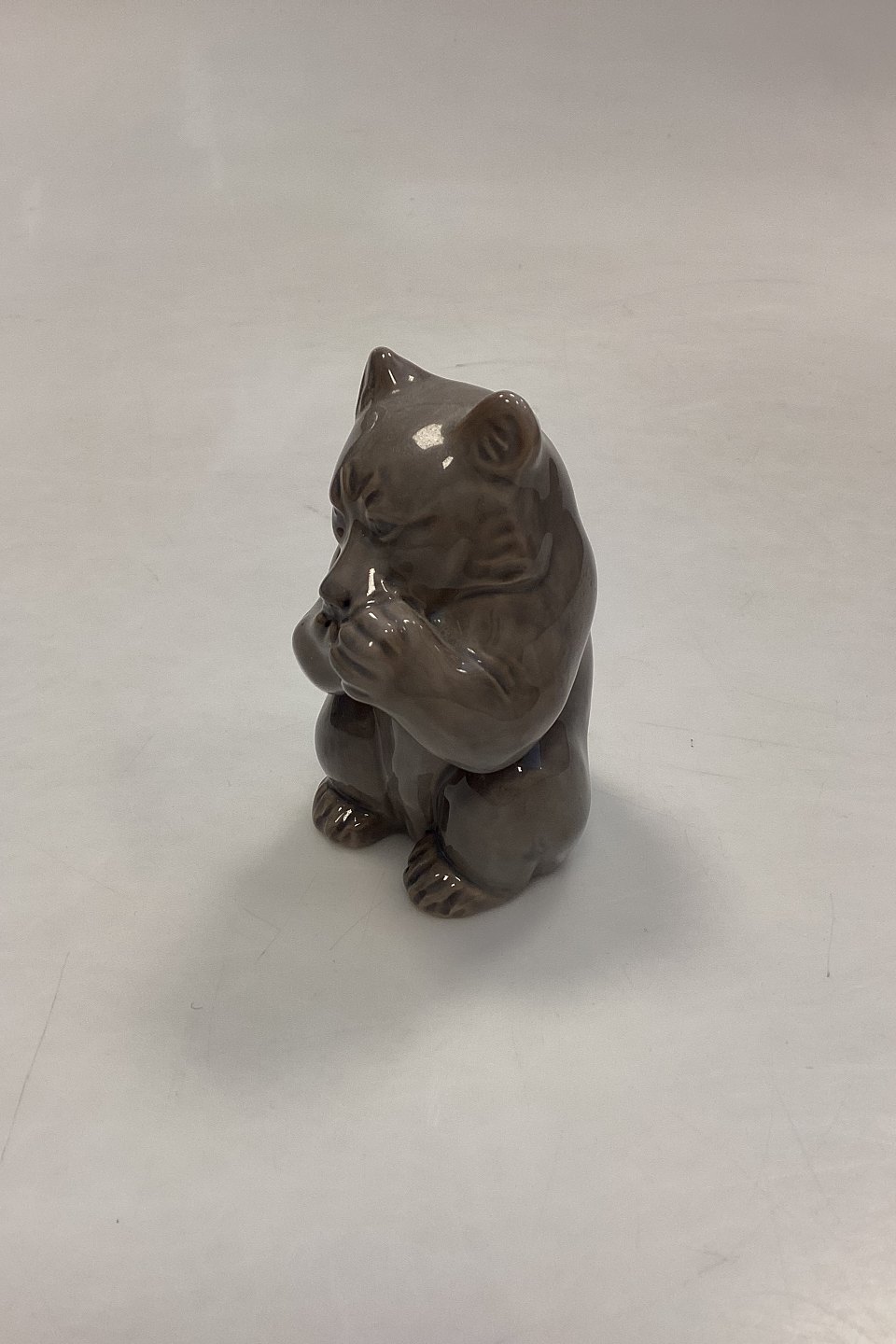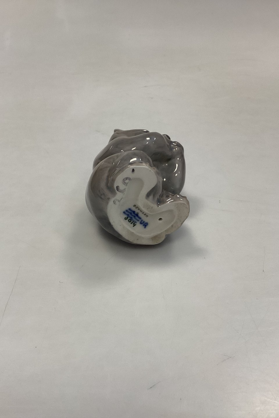 Royal Copenhagen Figur af Bjørneunge No. 3014. Designet af Knud Kyhn. Måler 9 cm / 3,54 in. Lysegrå nuancer.
