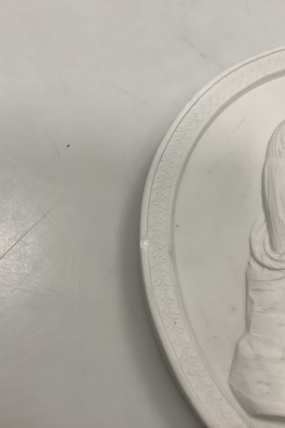 Royal Copenhagen Bisque Plate "Maria with Jesus and Johannes" No 120. Copy from 1841 after Thorvaldsen relief in Rom 1806. Measures 13,5cm (5.31 inch). Small chip 9 o'clock