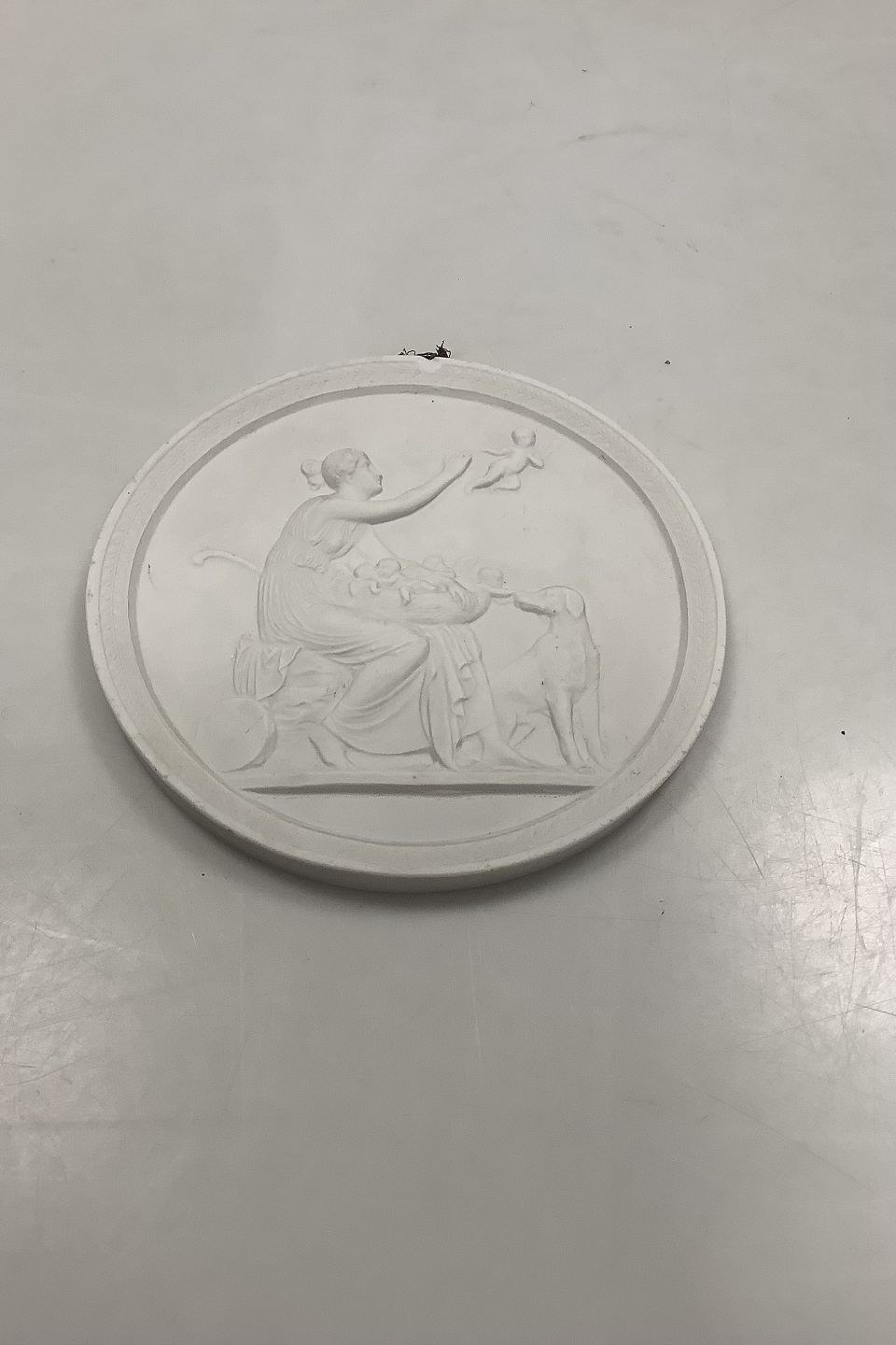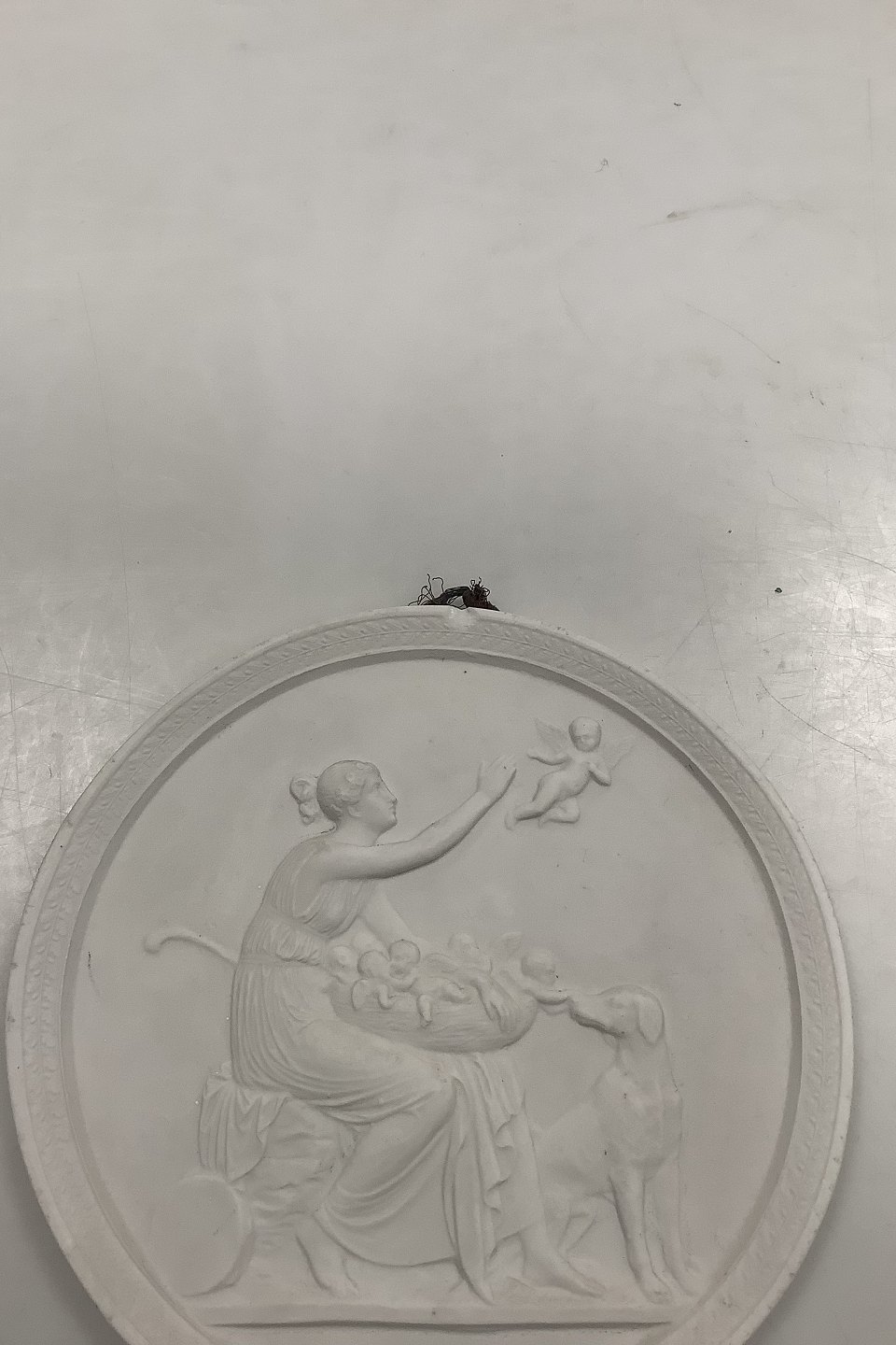 Royal Copenhagen Biscuit Platte Hyrdinde med en Amorinerede. No 110. Kopi af Christian Christensen fra 1845 after Thorvaldsens original fra Rom 1831. Måler 13cm / 5.12 inch