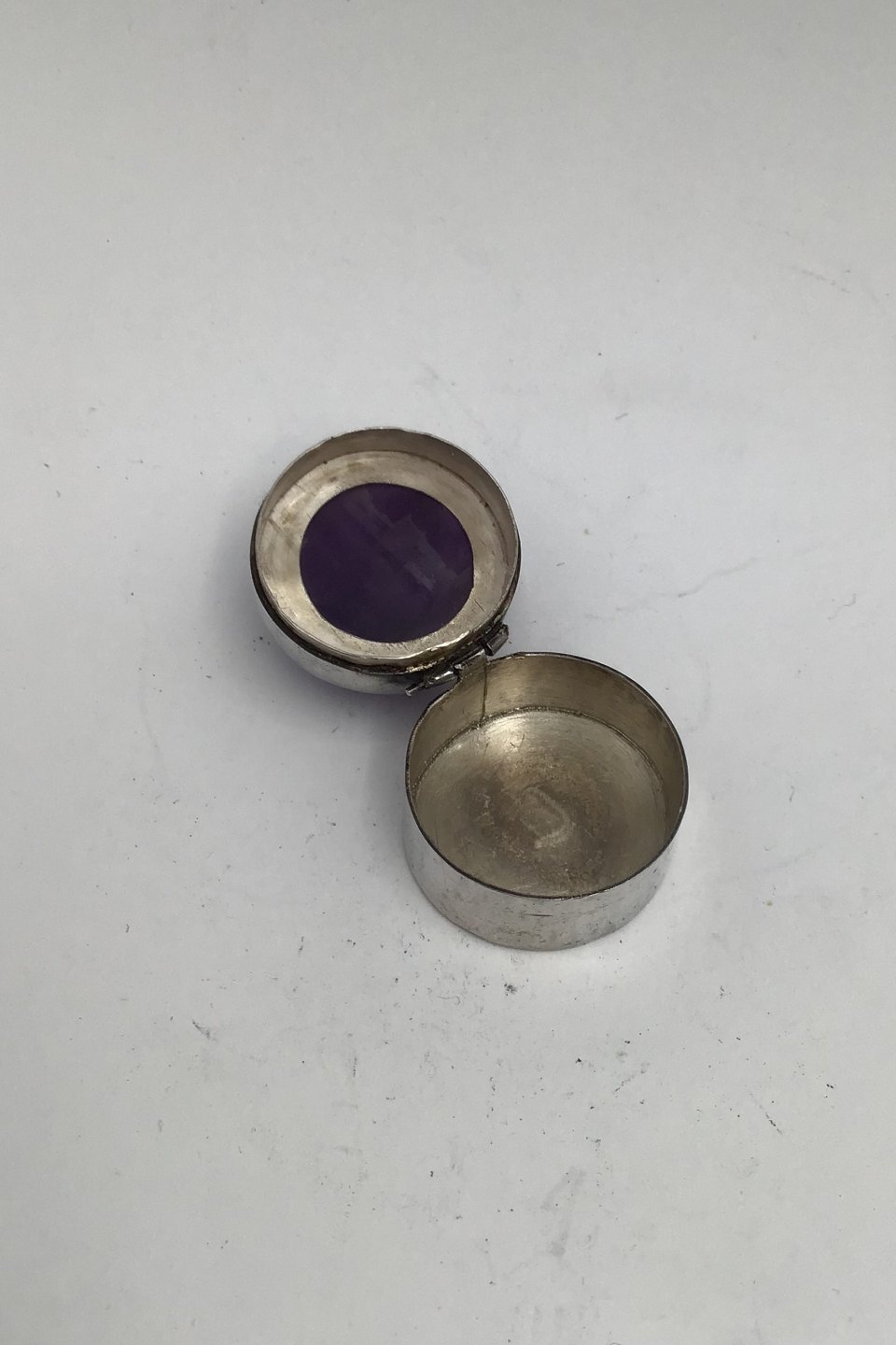 Rafmex Taxco Mexico Silver Pill Box (Amethyst) Measures Diam 2.5 cm (0.98 inch) Weight 20.7 gr (0.73 inch)