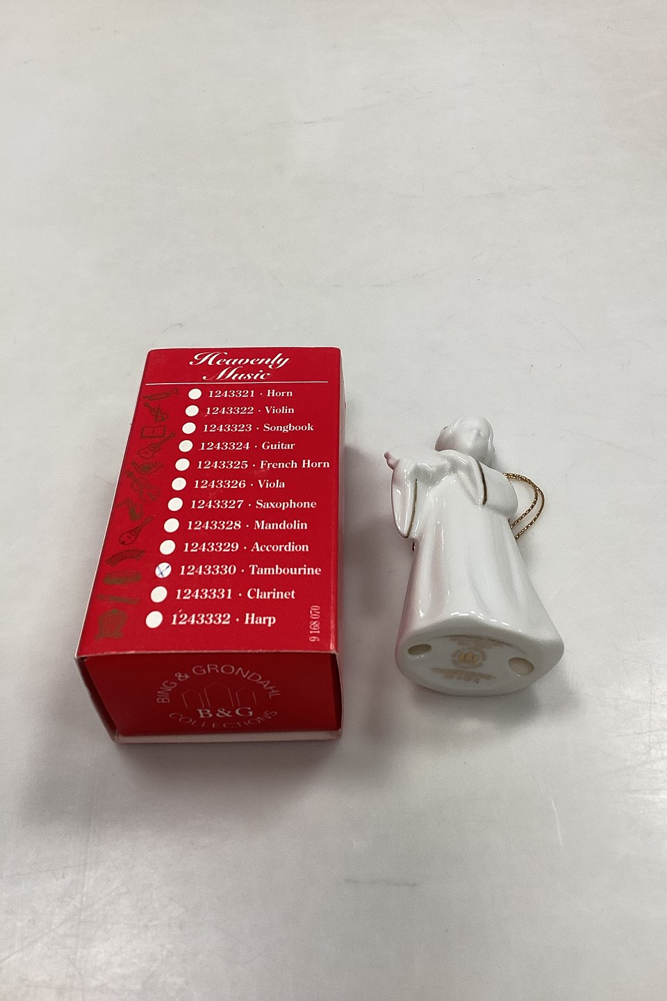 Bing og Grøndahl Figur Heavenly Music Engel - Tamburin No. 10. Juleornament i blanc de chine porcelæn med guld og snor til ophæng. Måler 9,5 cm / 3,74 in.