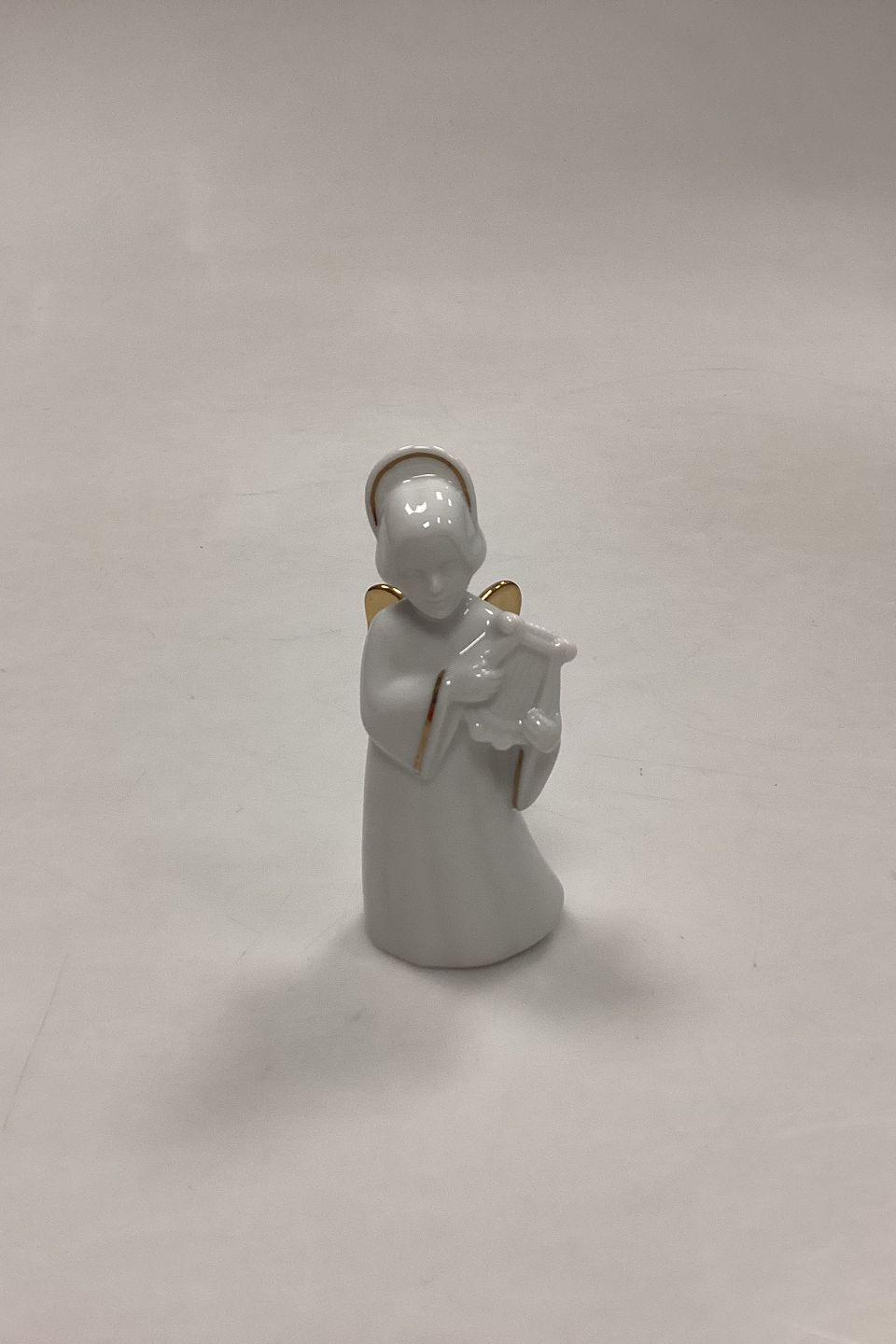 Bing og Grøndahl Figur Heavenly Music Engel - Harpe No. 12. Juleornament i blanc de chine porcelæn med guld og snor til ophæng. Måler 9,5 cm / 3,74 in.