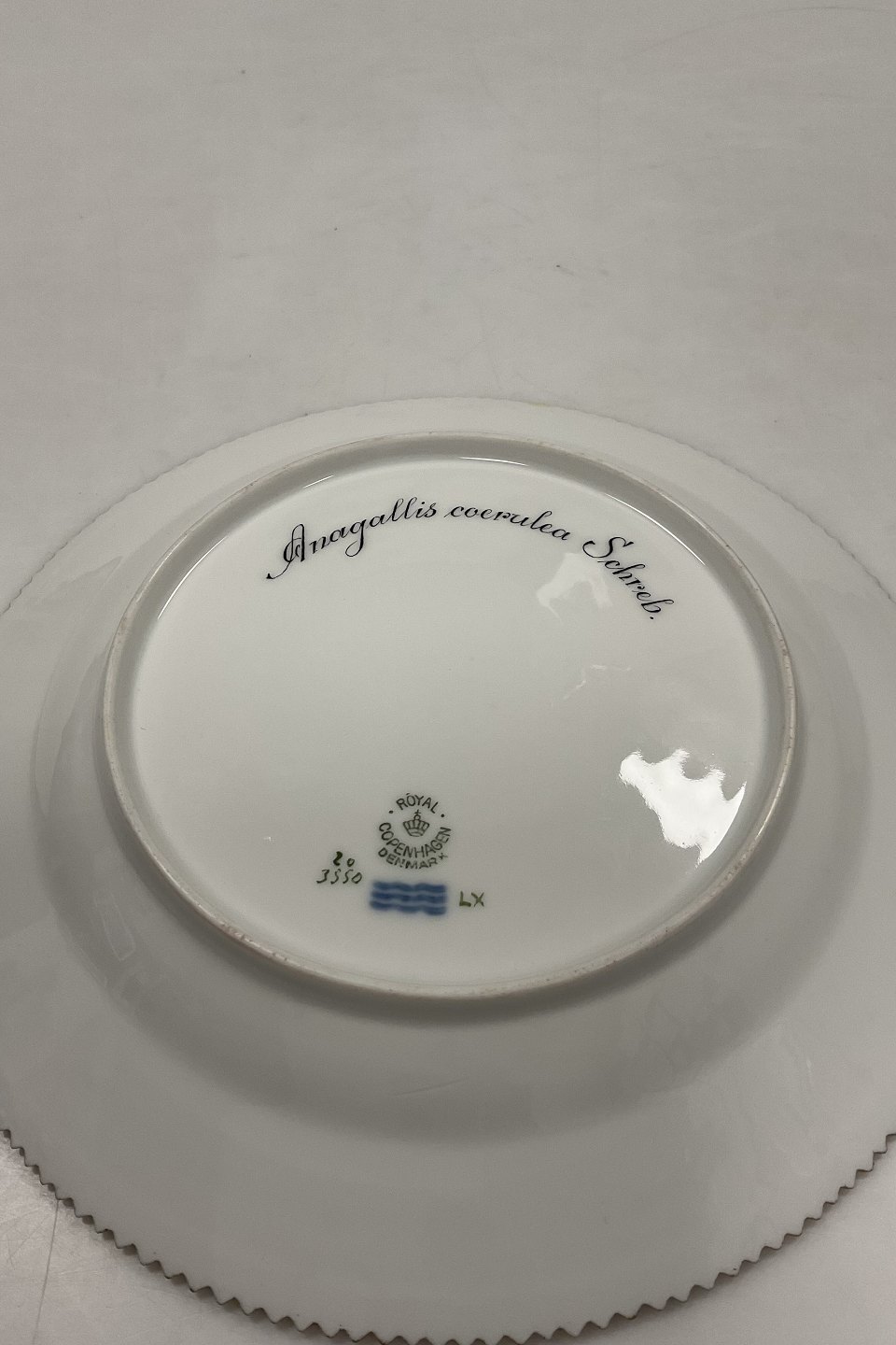 Royal Copenhagen Flora Danica Lunch Plate No 20/3550. Measures 22 cm / 8 21/32 in. 1st Quality. Latin name: Anagallis coerulea Schreb