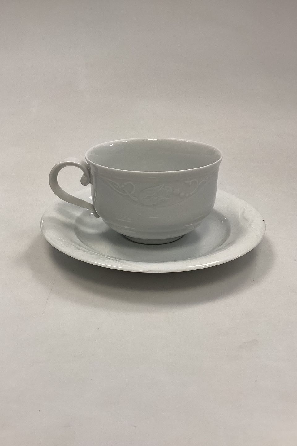 Royal Copenhagen White Magnolia Glazed Teacup and Saucer No. 84/85. Measurements - Cup: 6 cm x 9.5 cm / 2.36 in. x 3.74 in. Saucer: 16.5 cm / 6.49 in. 3rd Quality