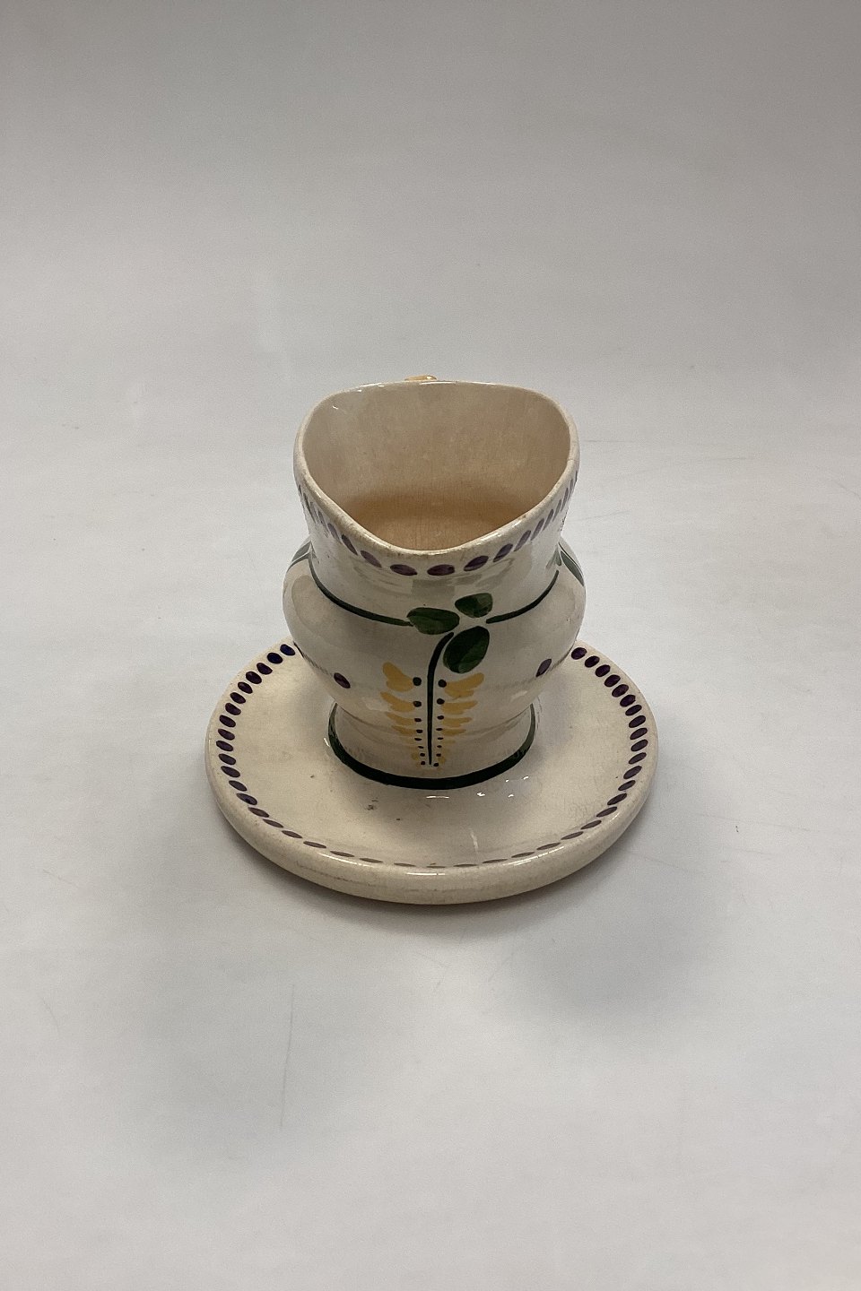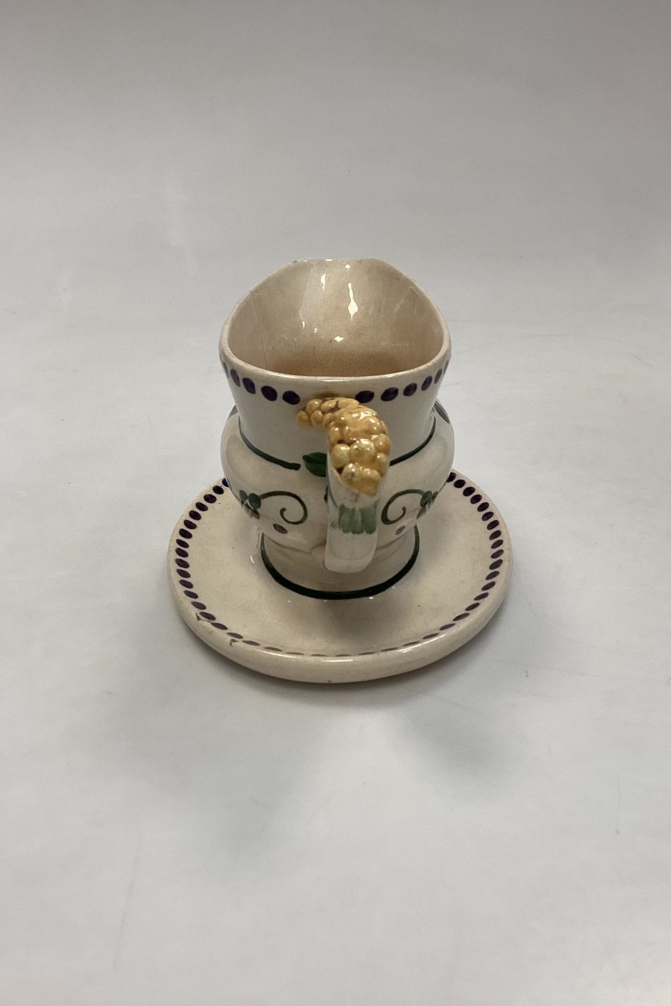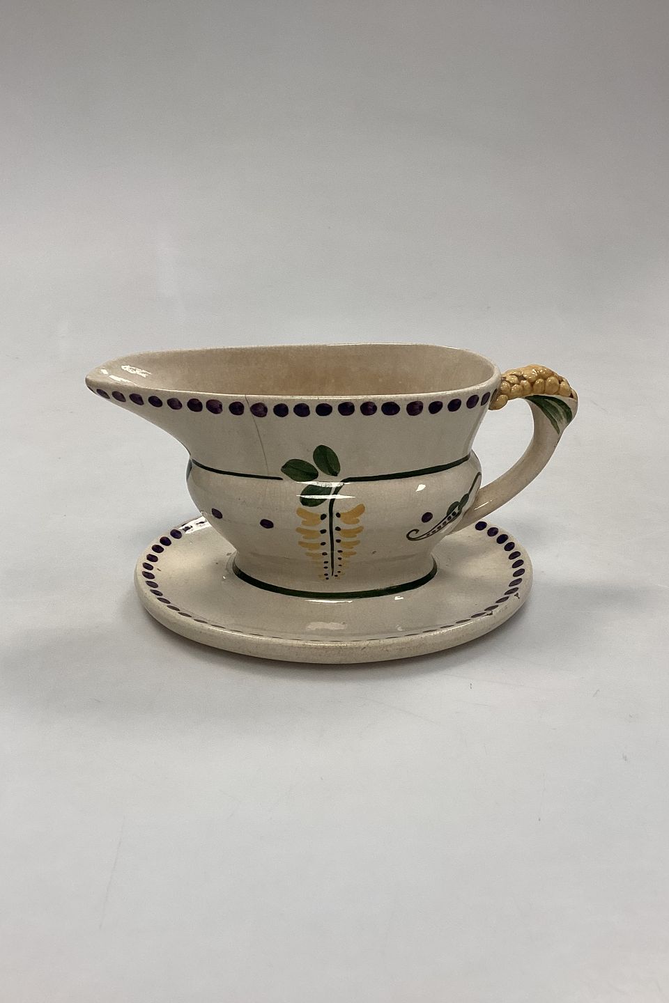 Aluminia Guldregn (Laburnum) Sauce Bowl with solid base No. 10/189. Cracks, hairline cracks and chipping on the edge, see photo. Designed by Harald Slott-Møller 1902.