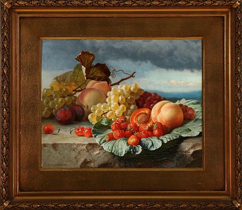 "Opstilling med ferskner, blommer, kirsebær, jordbær og druer på stenkarm. Olemaleri.