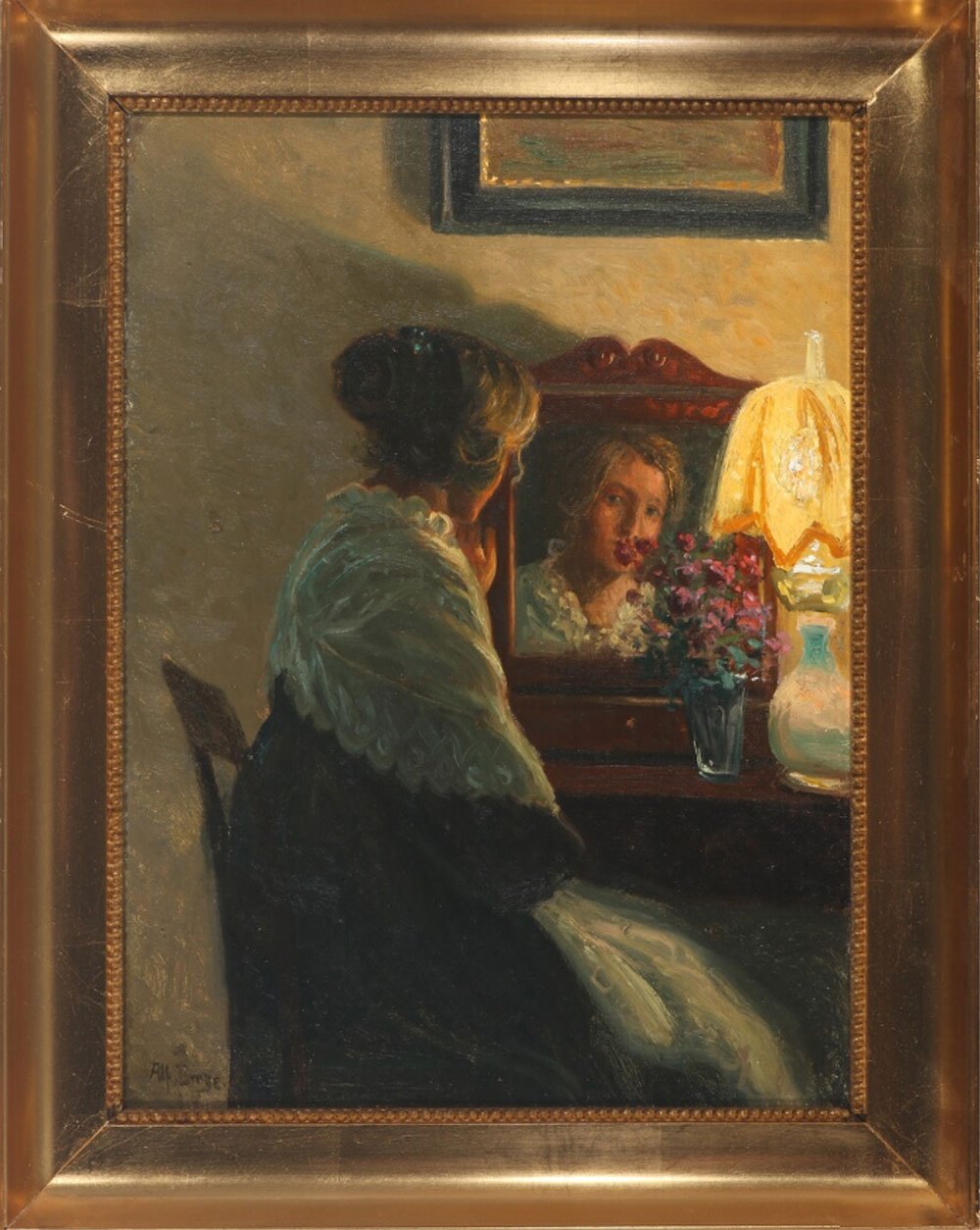 "Interiør med kvinde foran spejl" Olie maleri på lærred.