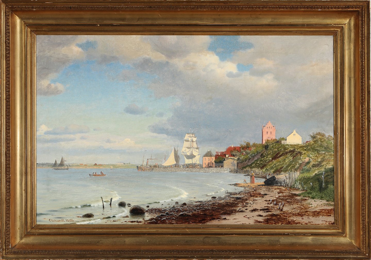 "Kystparti med sejlskibe ved Middelfart havn" Olie maleri på lærred.