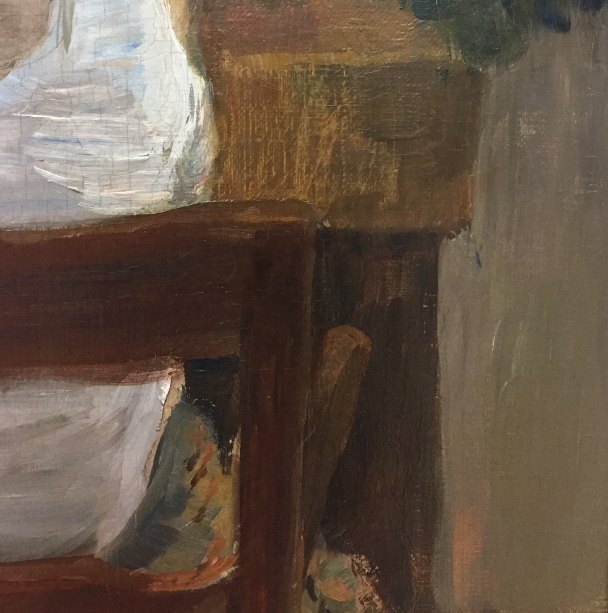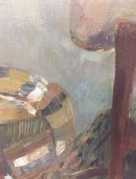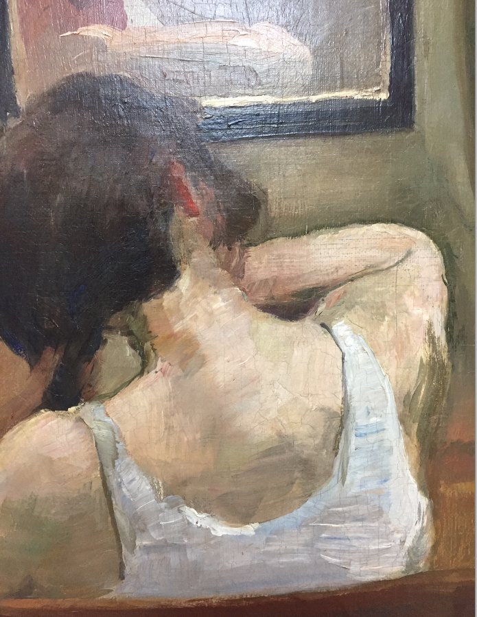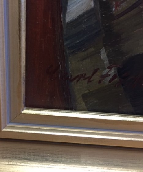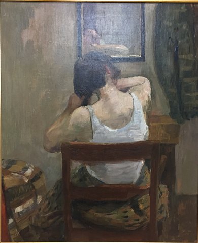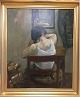 "Interiør med kunstnerens hustru" Olie maleri på lærred, monteret på plade.