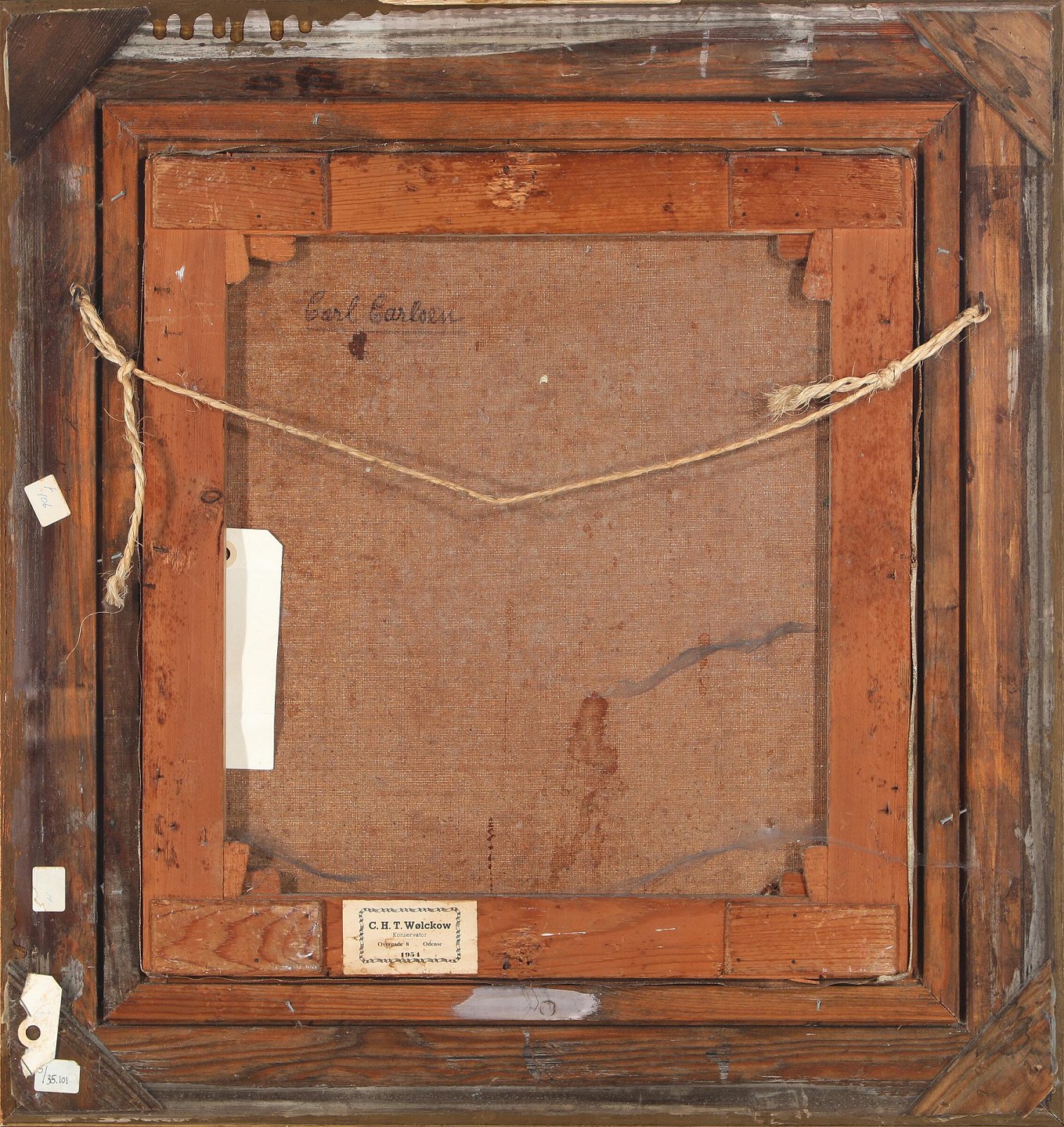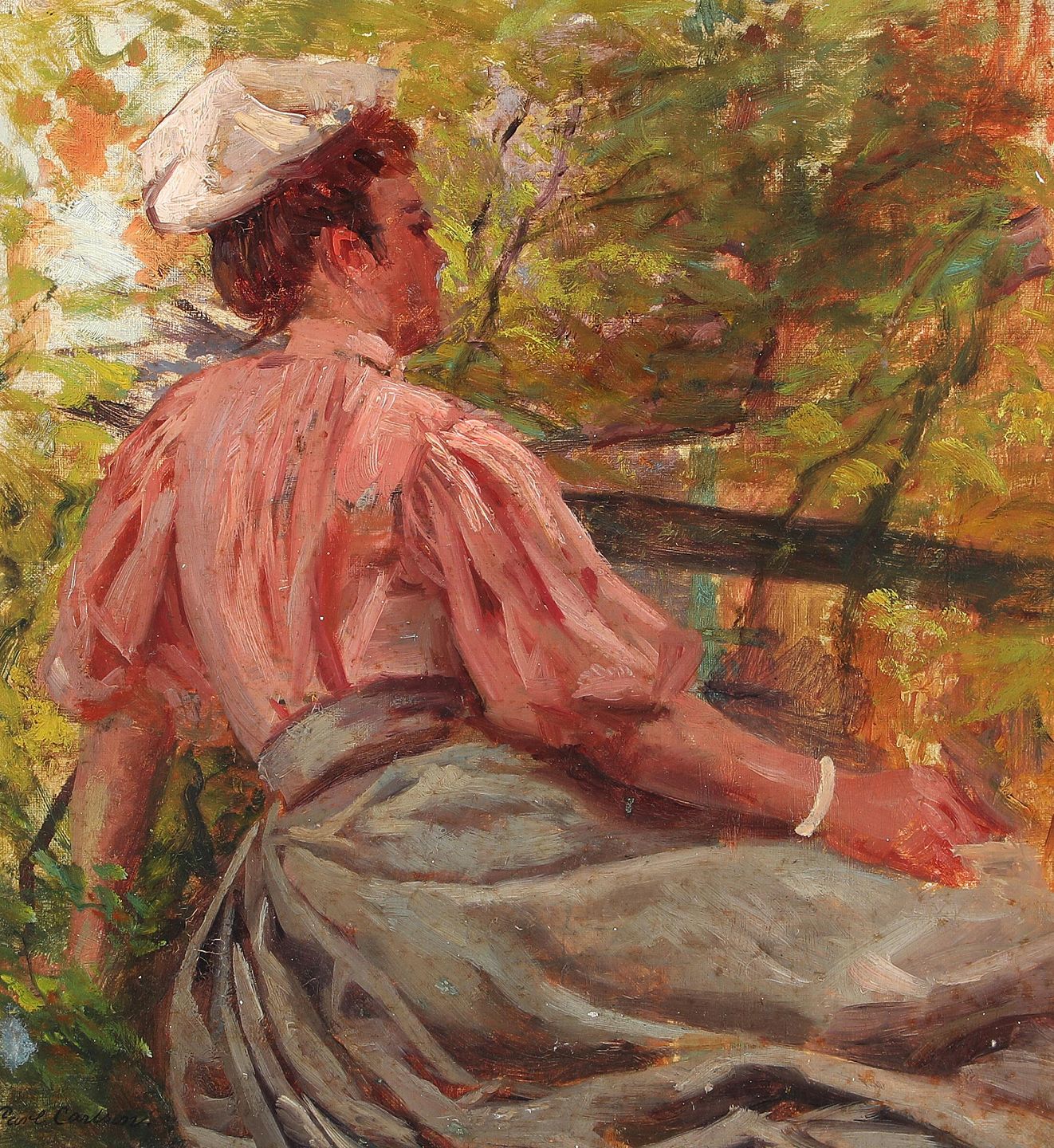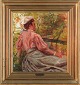 "Summer party with back-turned woman in bright clothes" Oil painting on canvas, signed. Carl Carlsen.