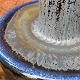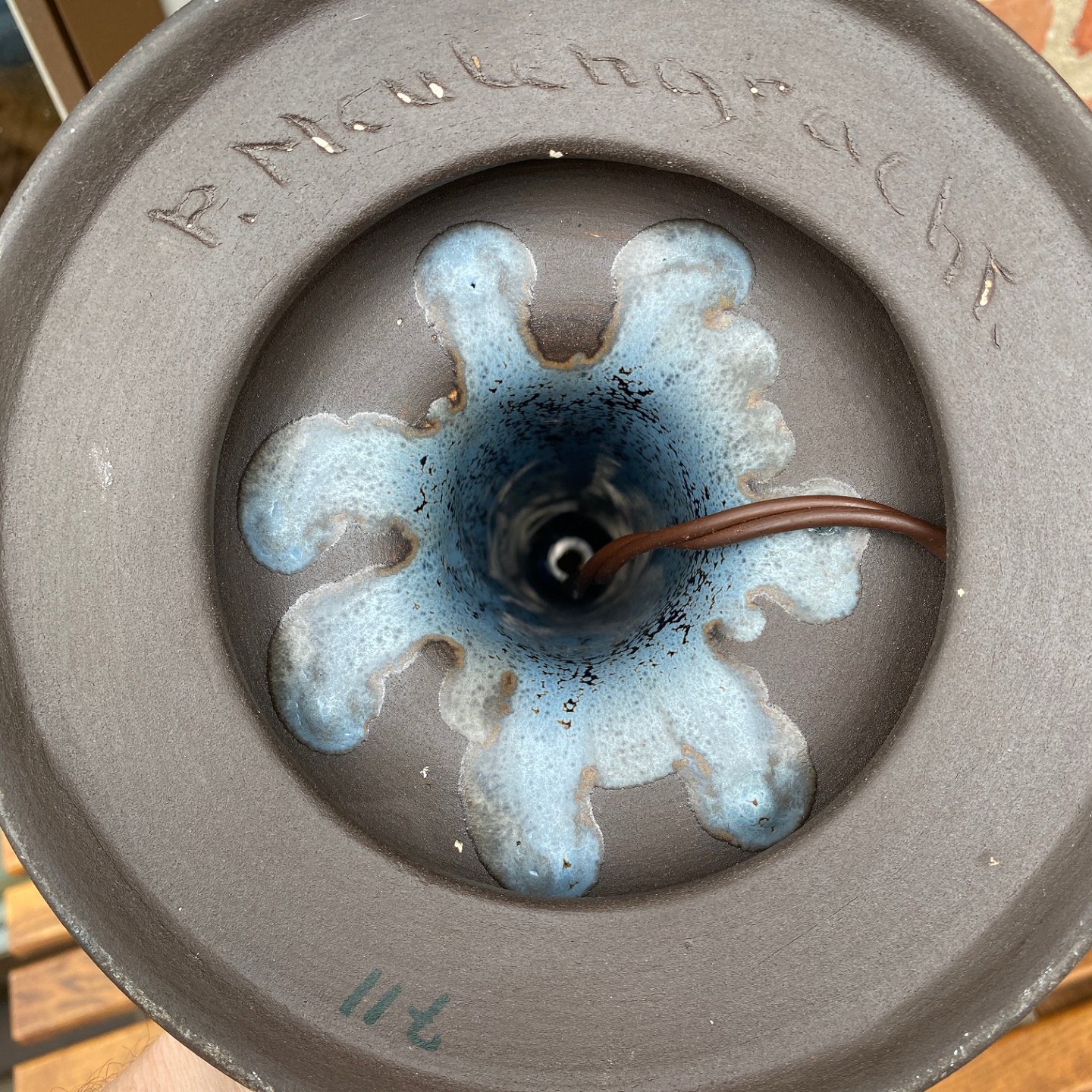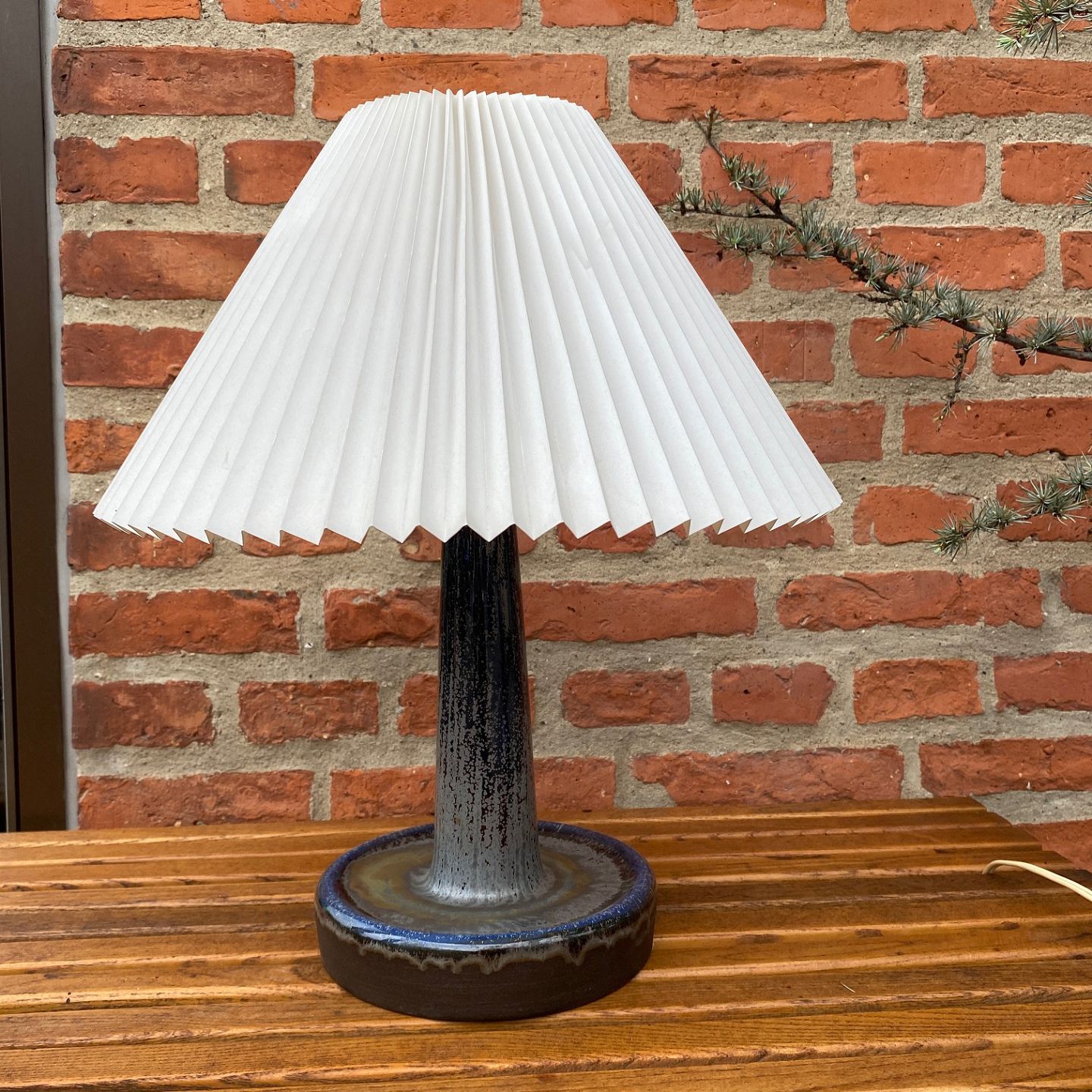 Bordlampe i blå-grå keramik, med hvid plisseskærm.