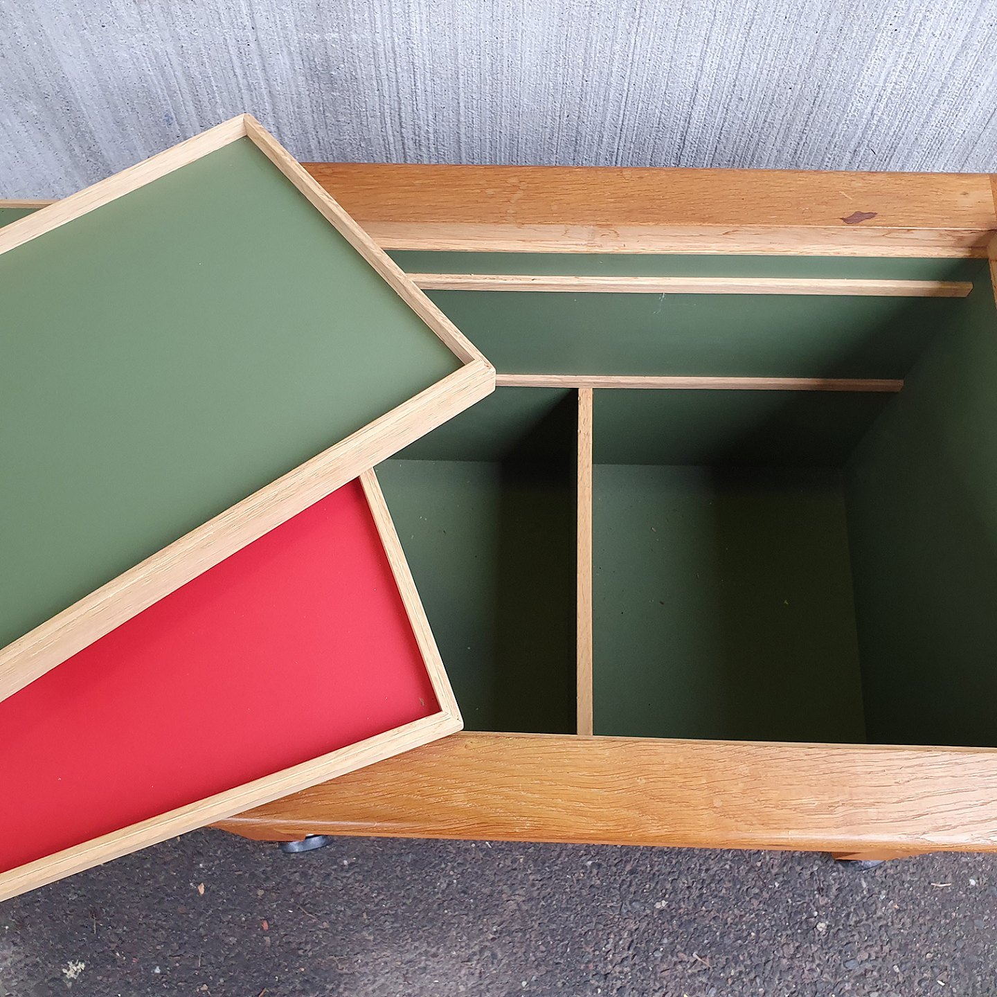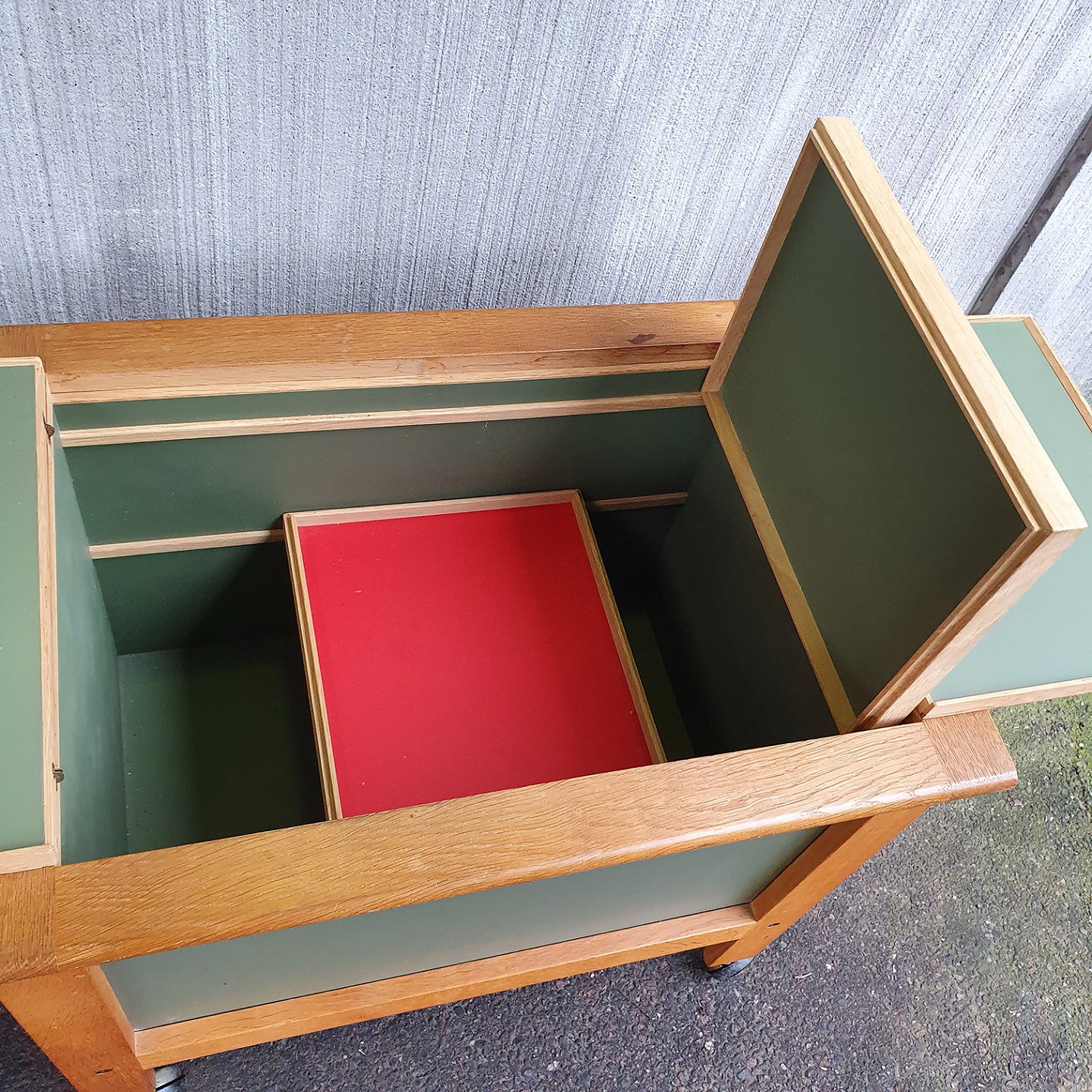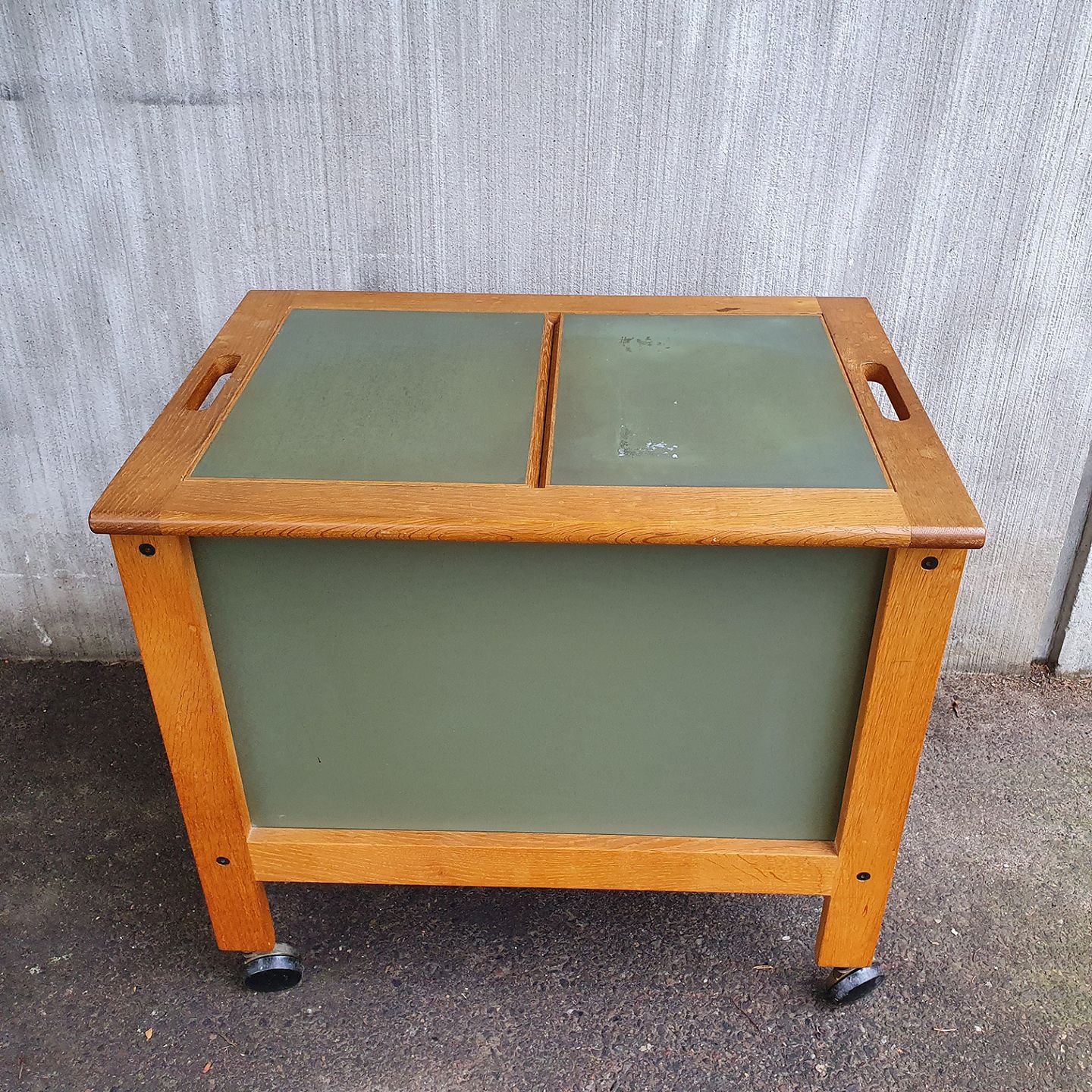 Barskab på hjul af egetræ og grøn laminat.Indvendig med bakker i massiv eg og rød og grøn laminat. Ikke identificeret designer/producent.God stand.