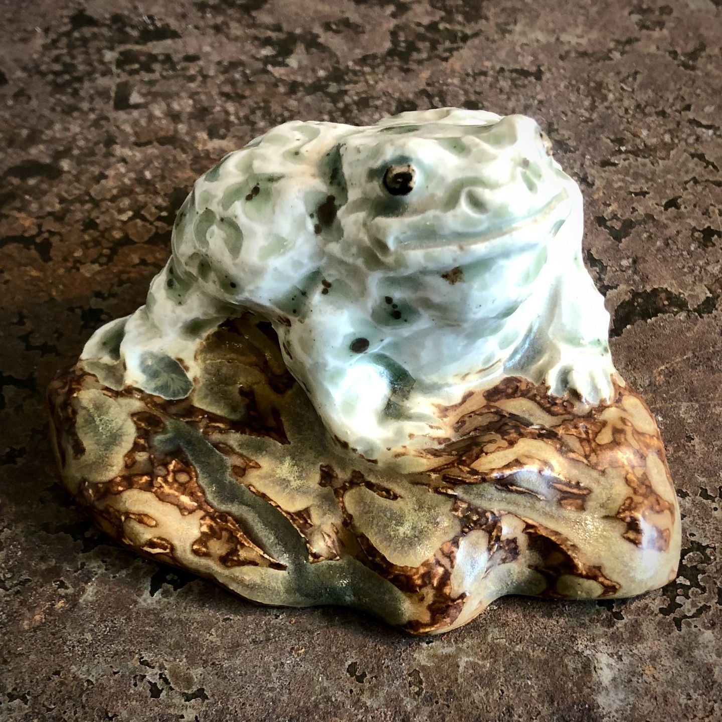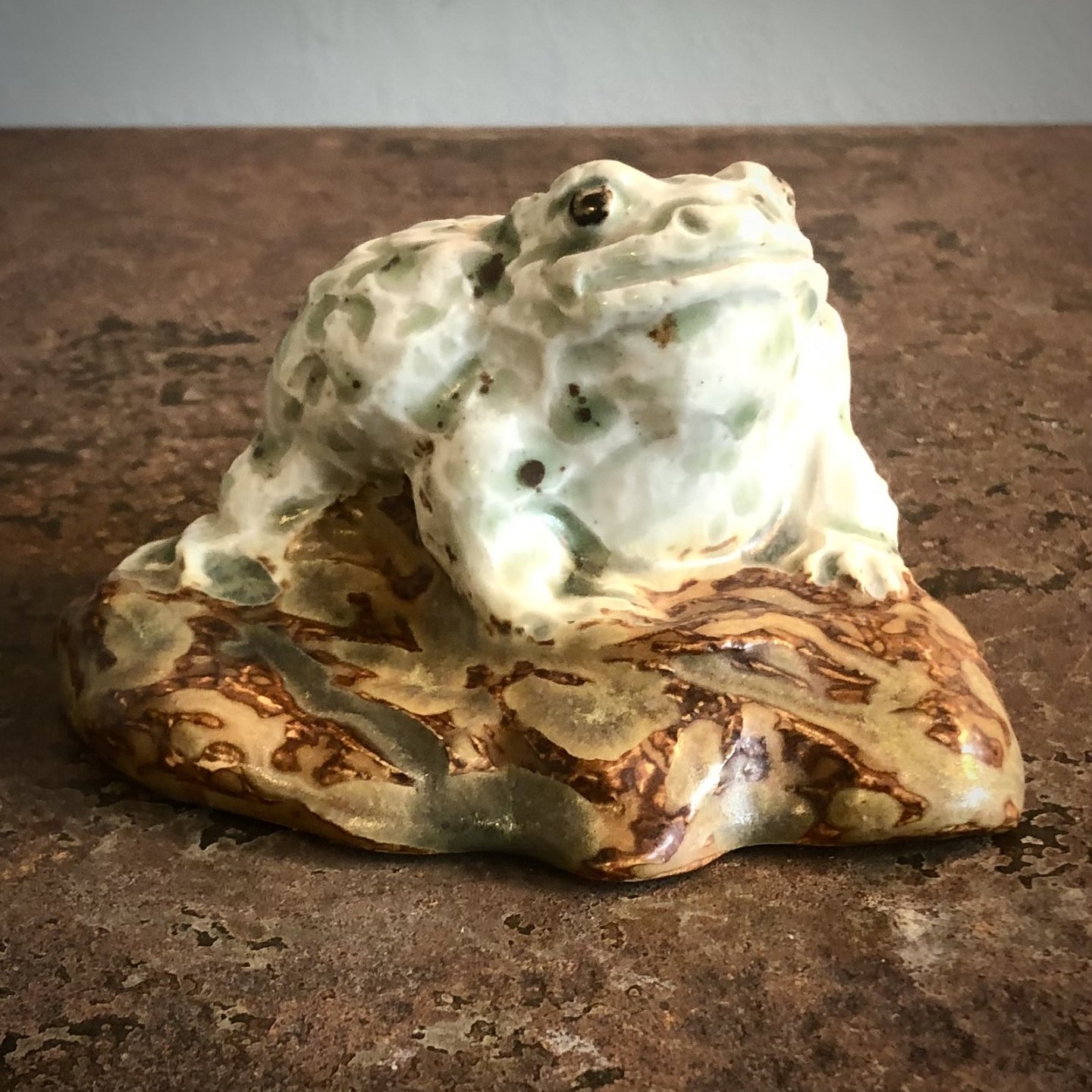 Cathinka Olsen"frøen på sten" af stentøj for Bing & Grøndahl. Model nr 541. H. 6,5 cm. 11 x 8,5 cm. Ikke mærket.