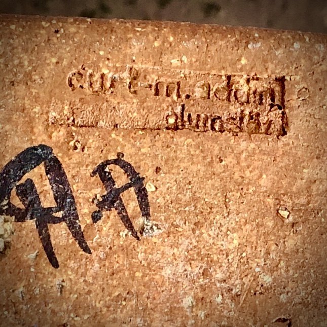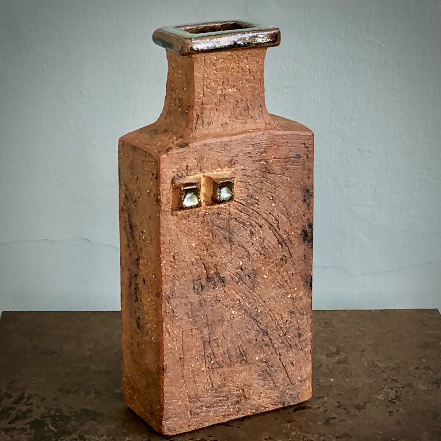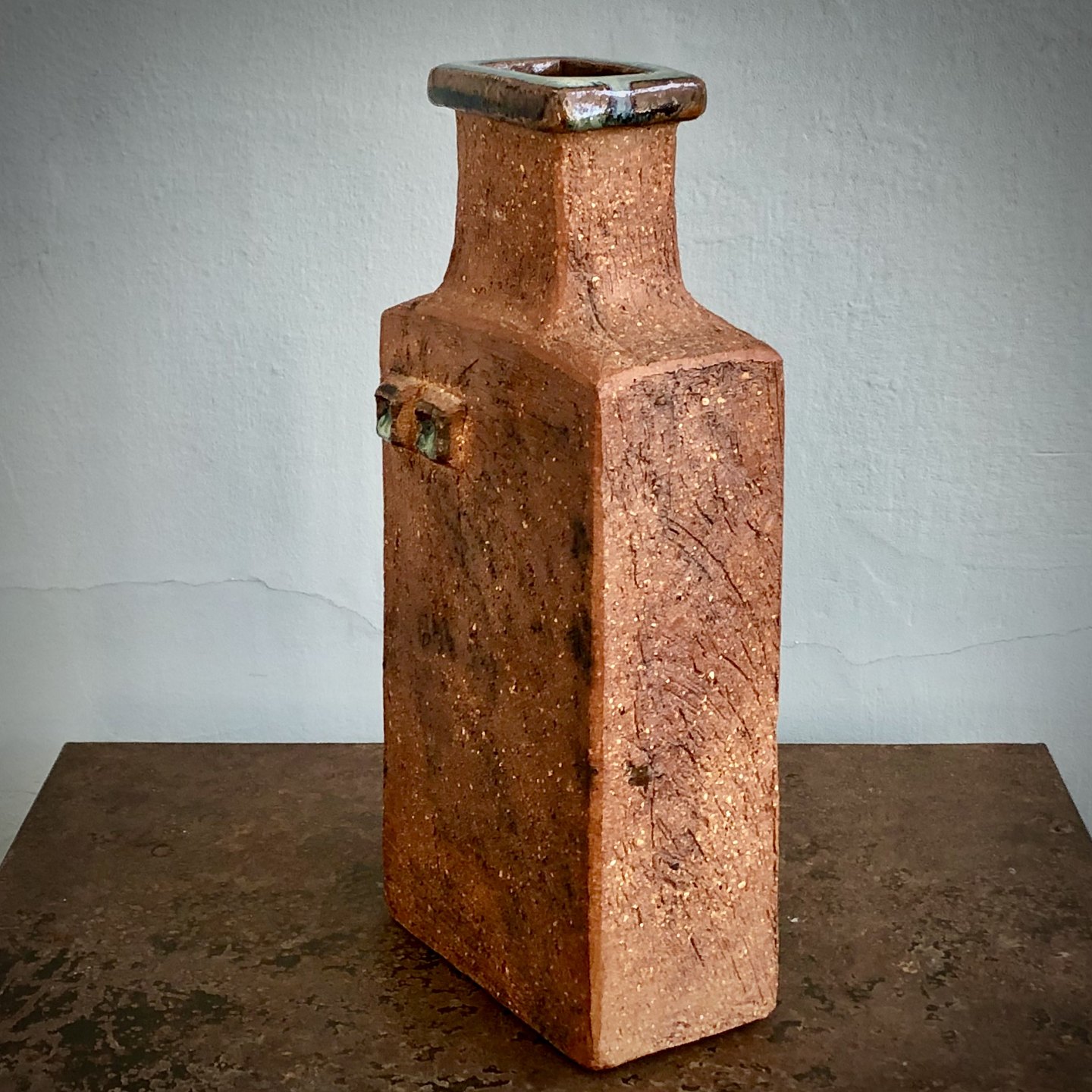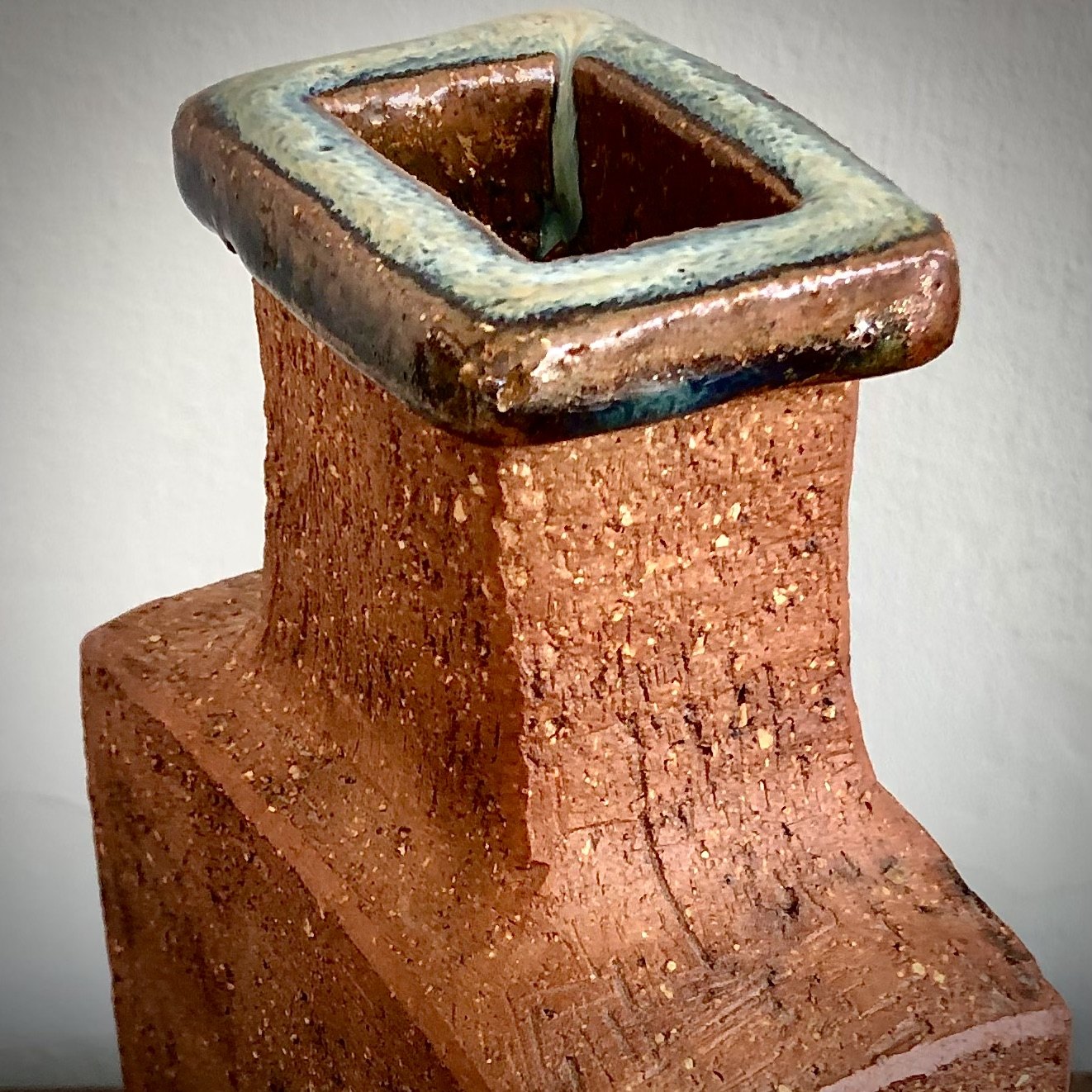 Curt M Addin Glumslov Vase of stoneware. Mouth with multicolored (Blue-green and white) glaze H. 29.5 cm. B. 13 cm. D. 6.5 cm. Signed at the bottom Curt M Addin, Glumslov Sweden.