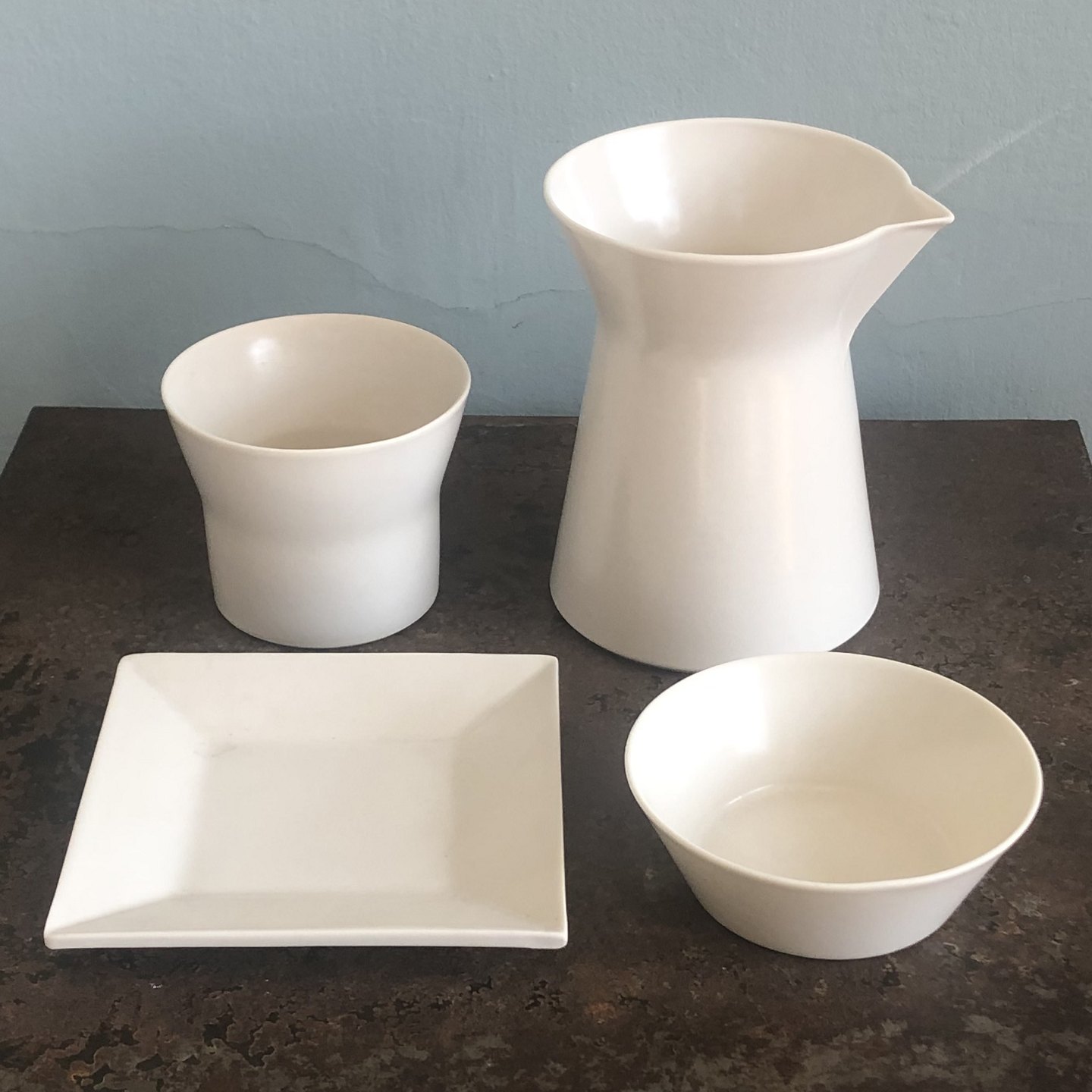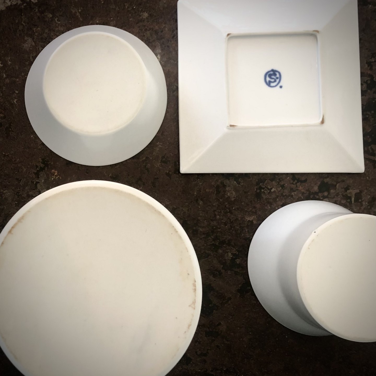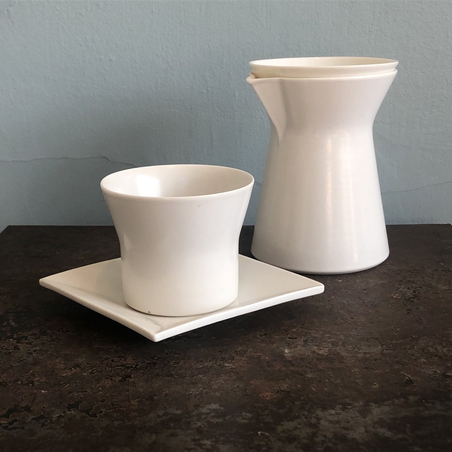Water carafe and porcelain cup. Hour-shaped water carafe with onion H. 15 cm. Top 12 cm, bottom 11 cm. Cup or water cups with saucer: Cups H. 8 cm. D. 7.5 cm. Square saucer dimensions: 3.5 x 3.5 cm. Signed with blue monogran at the bottom S.
