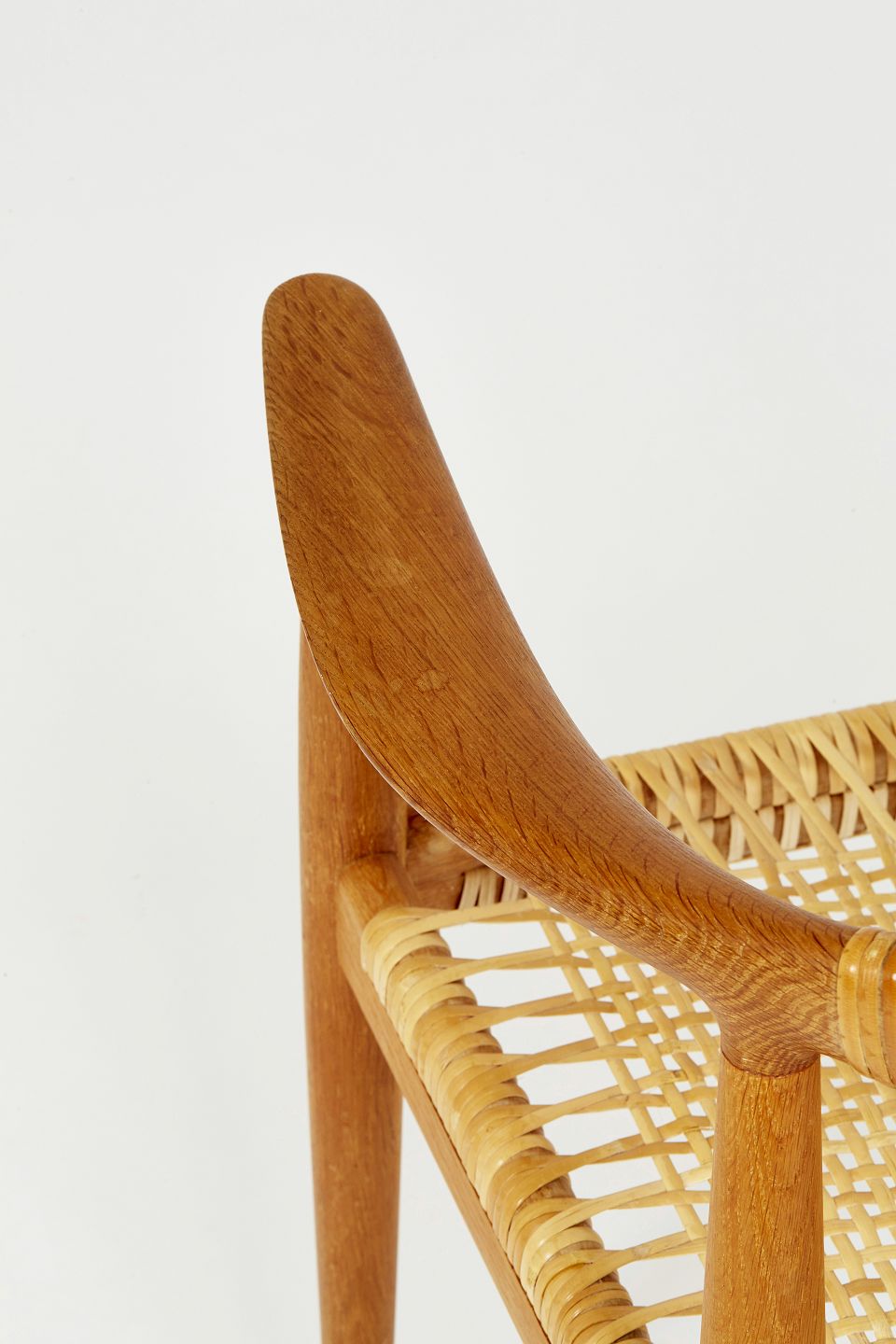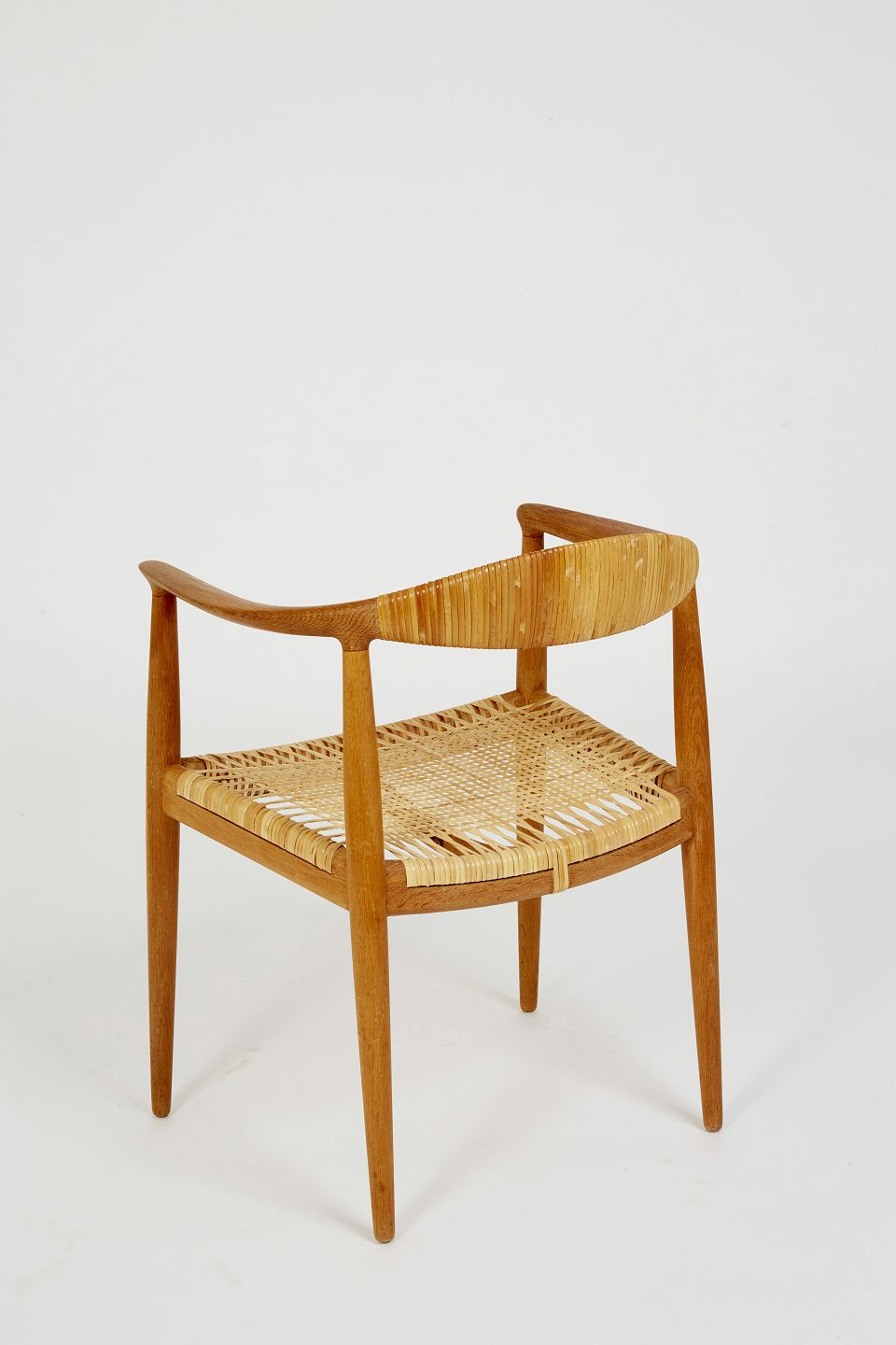 Hans J. Wegner Armstol, model JH-501 'Den Runde Stol'/'The Chair'/‘kennedy stolen’ med stel af massiv egetræ. Sæde og ryg monteret med flet.