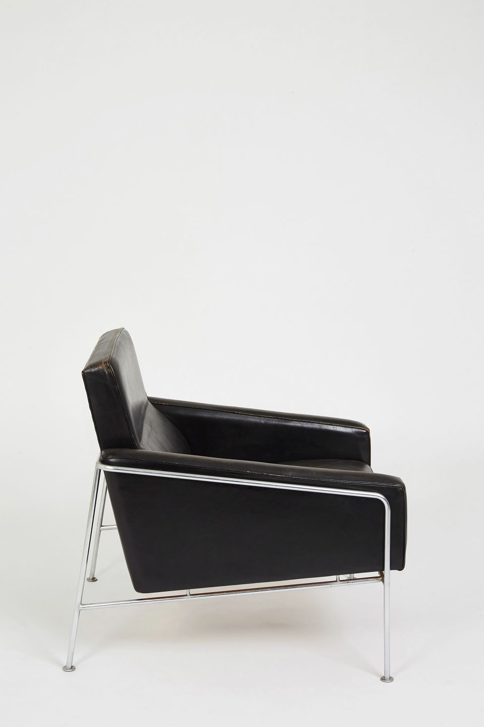 Arne Jacobsen. Lufthavnsstol i originalt sort patineret læder, stel af forkromet stål.Udført i tresserne.