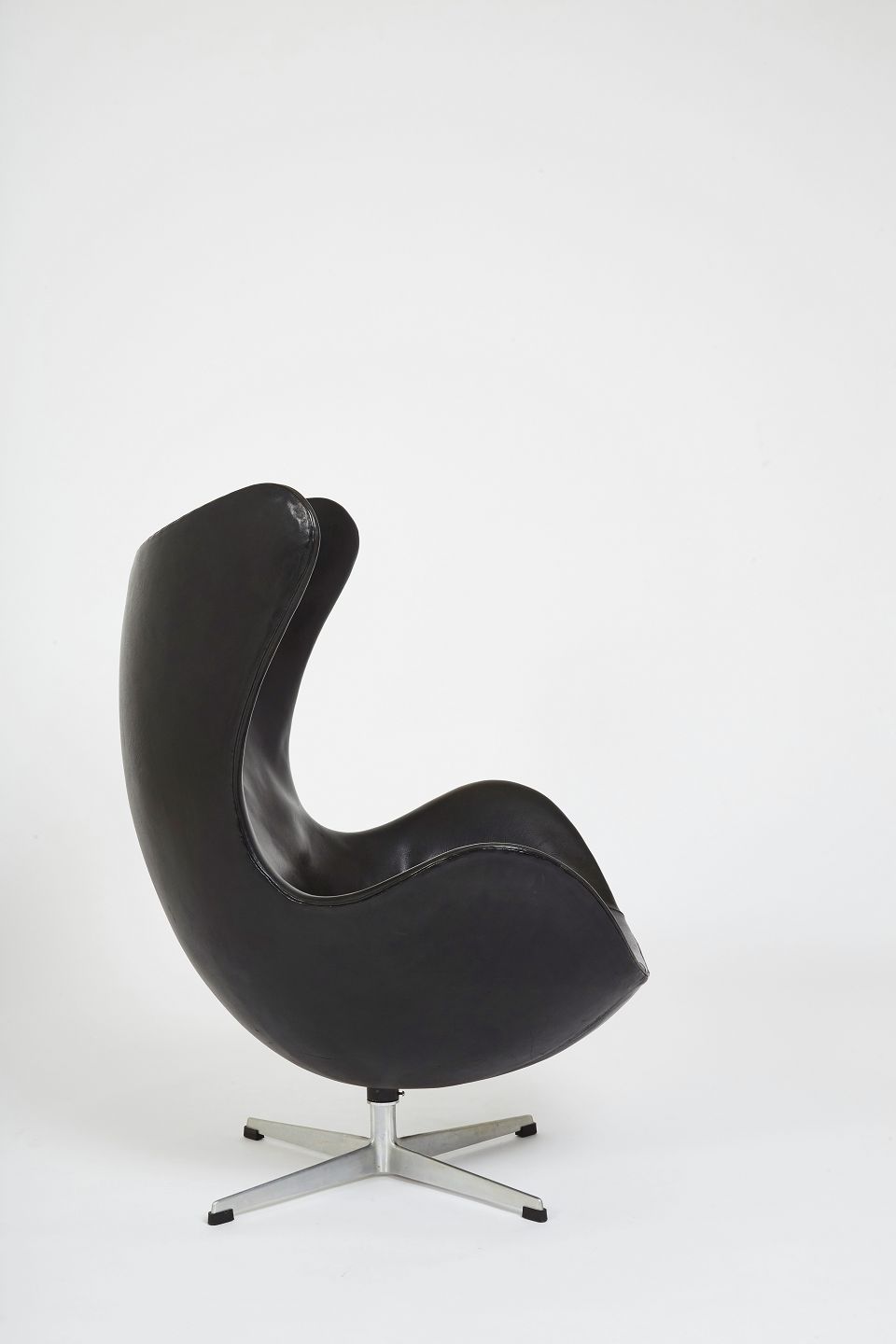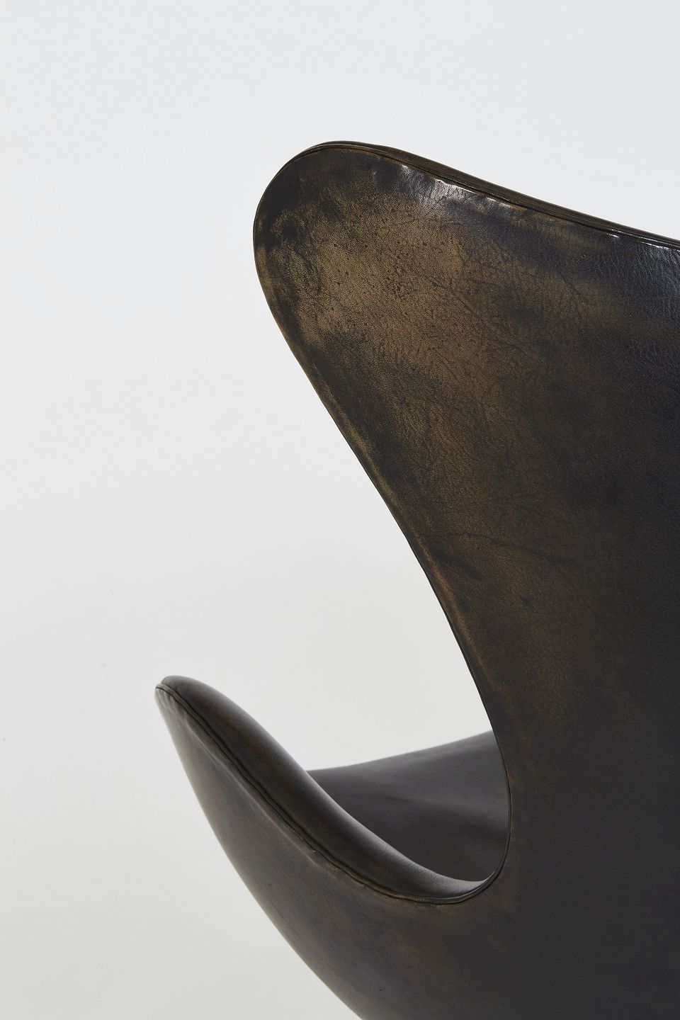 Stolen er betrukket med originalt patineret sort læder, monteret på drejelig midtersøjle samt helstøbt profileret fod af aluminium. Fremstillet hos Fritz Hansen , Formgivet i 1958-59 som en del af totalindretningen i Hotel Royal København.