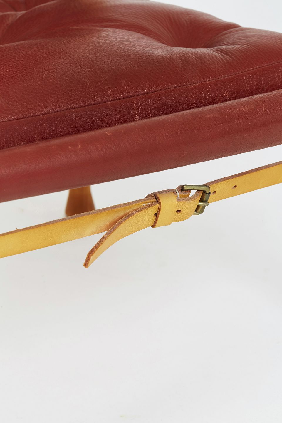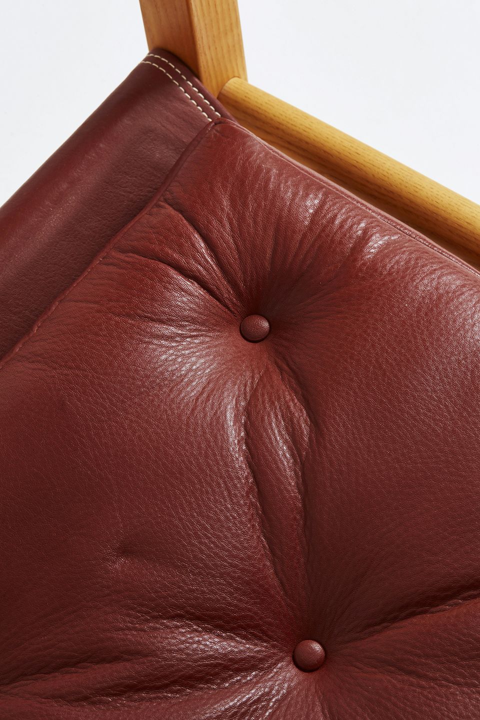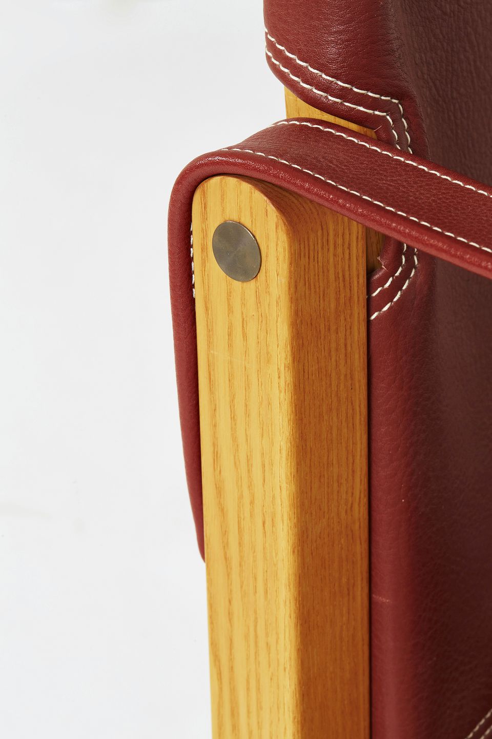Kaare Klint. Safaristol med stel af asketræ. Sæde, ryg, armlæn og knapsyet hynde betrukket med rødbrun læder.