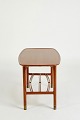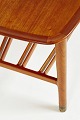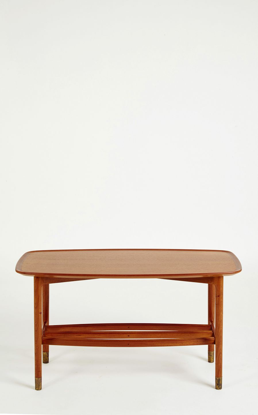 Itemnumber: 524578Mahogany coffee table with Kehlet edge. Shoes of patinated brass. Magazine shelf with three massive crossbars, the two outermost of which are slightly curved. Cabinetmaker work from the 1930ties. H. 56 cm. W. 105 cm. D. 52 cm.