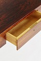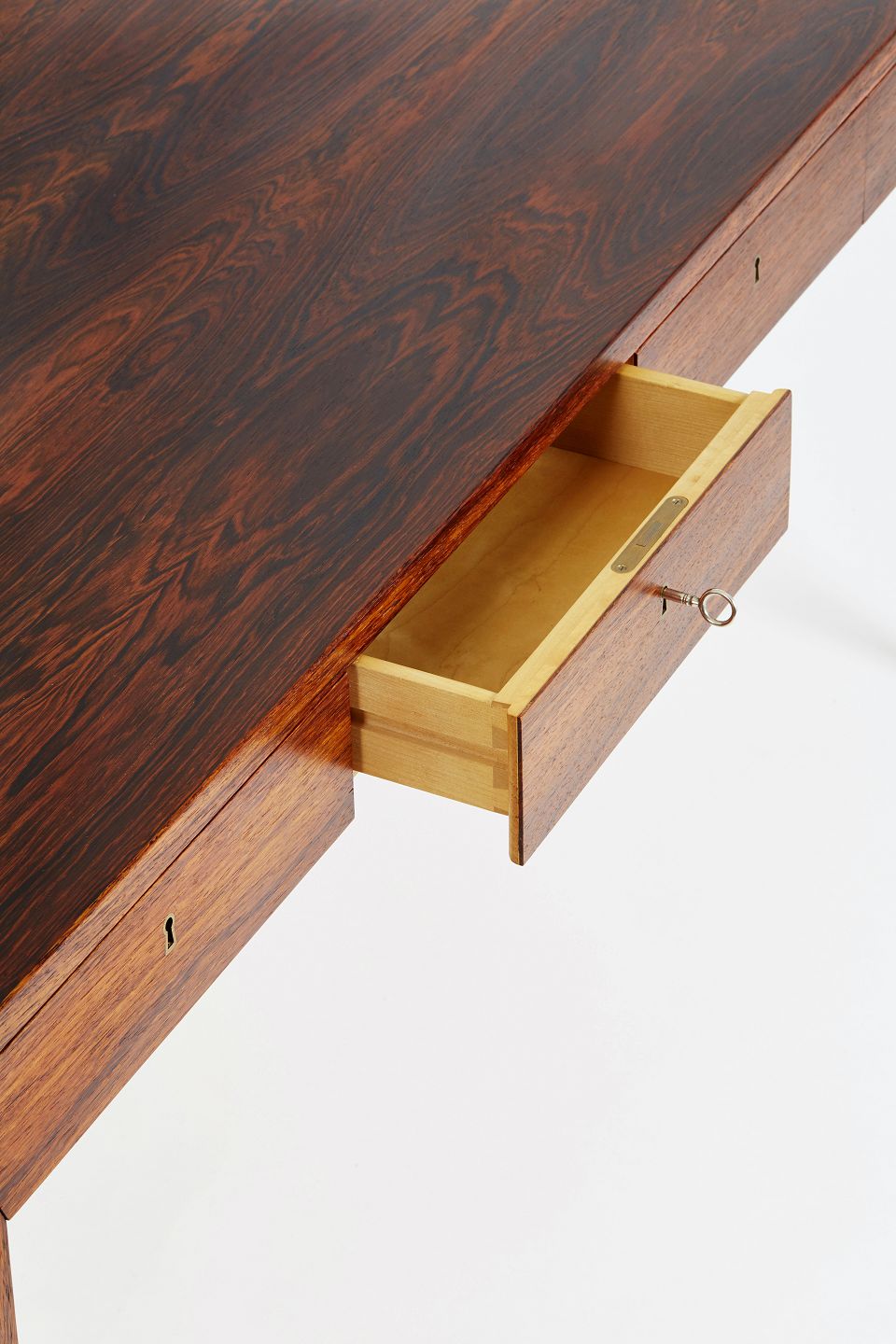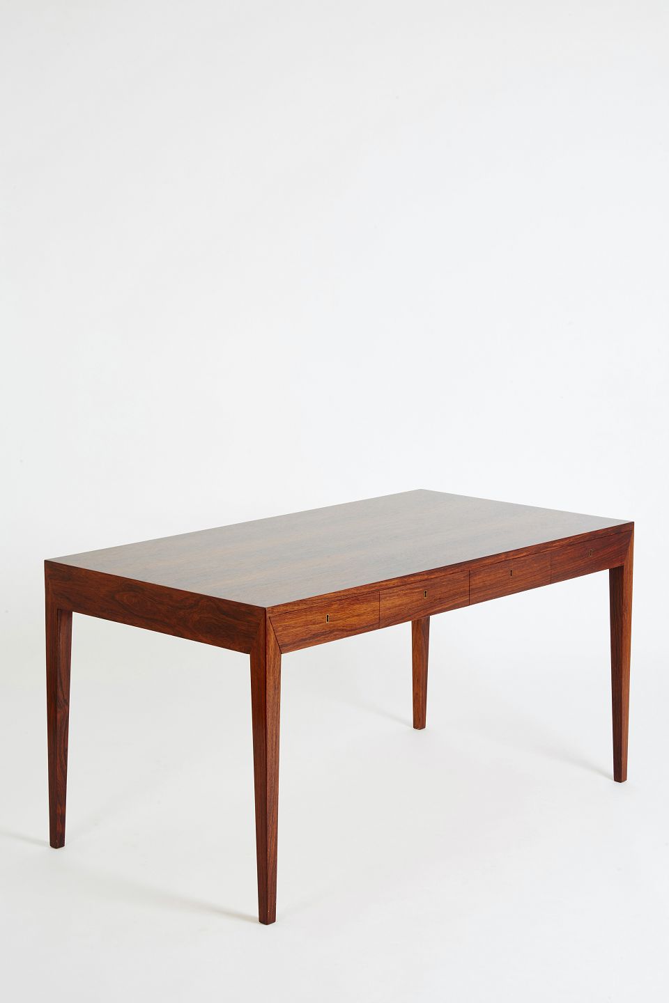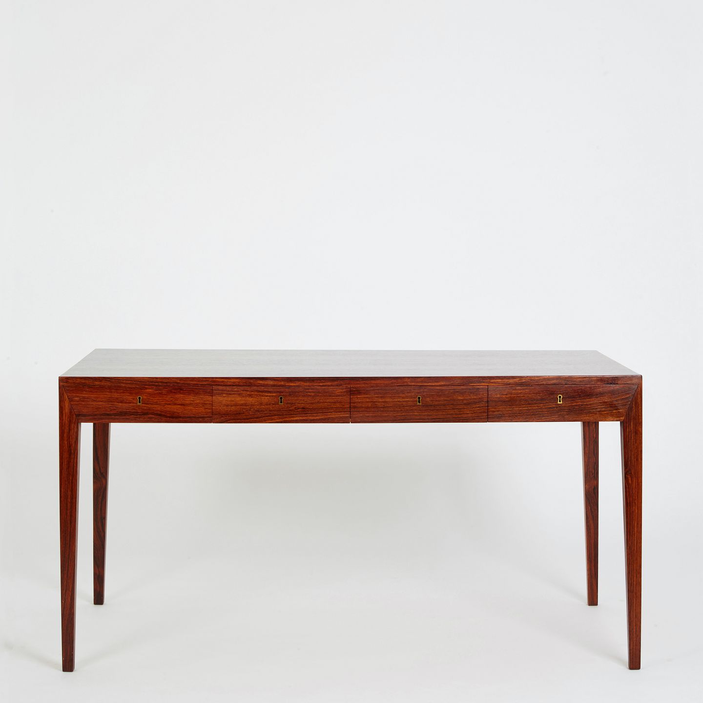 Severin Hansen Junior. Freestanding rosewood desk. Front with four integrated drawers with lock, standing on tapered legs with bevelled joints, brass keyholes.