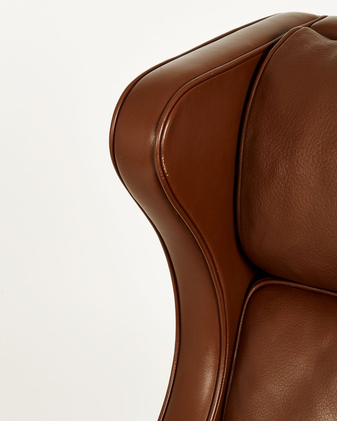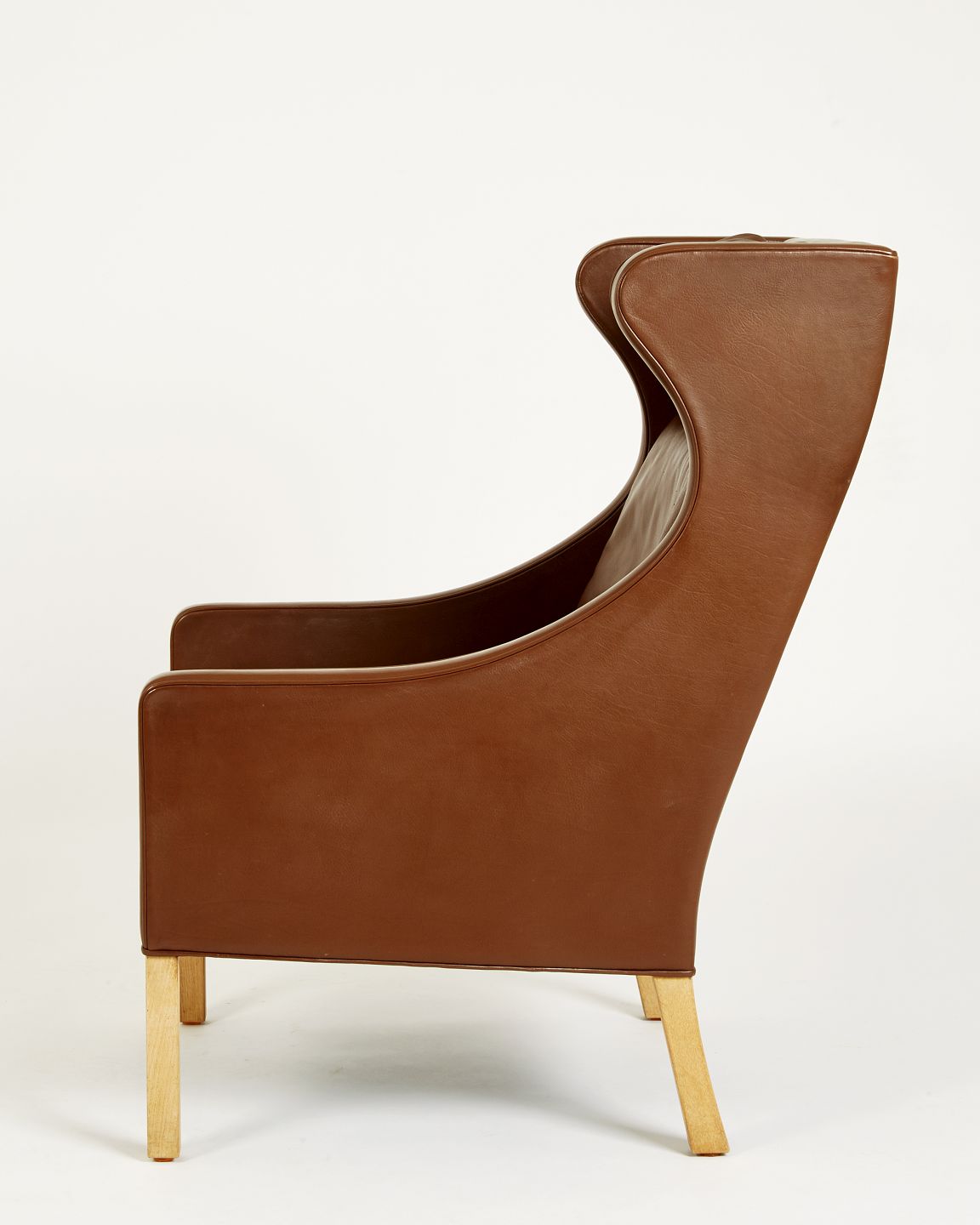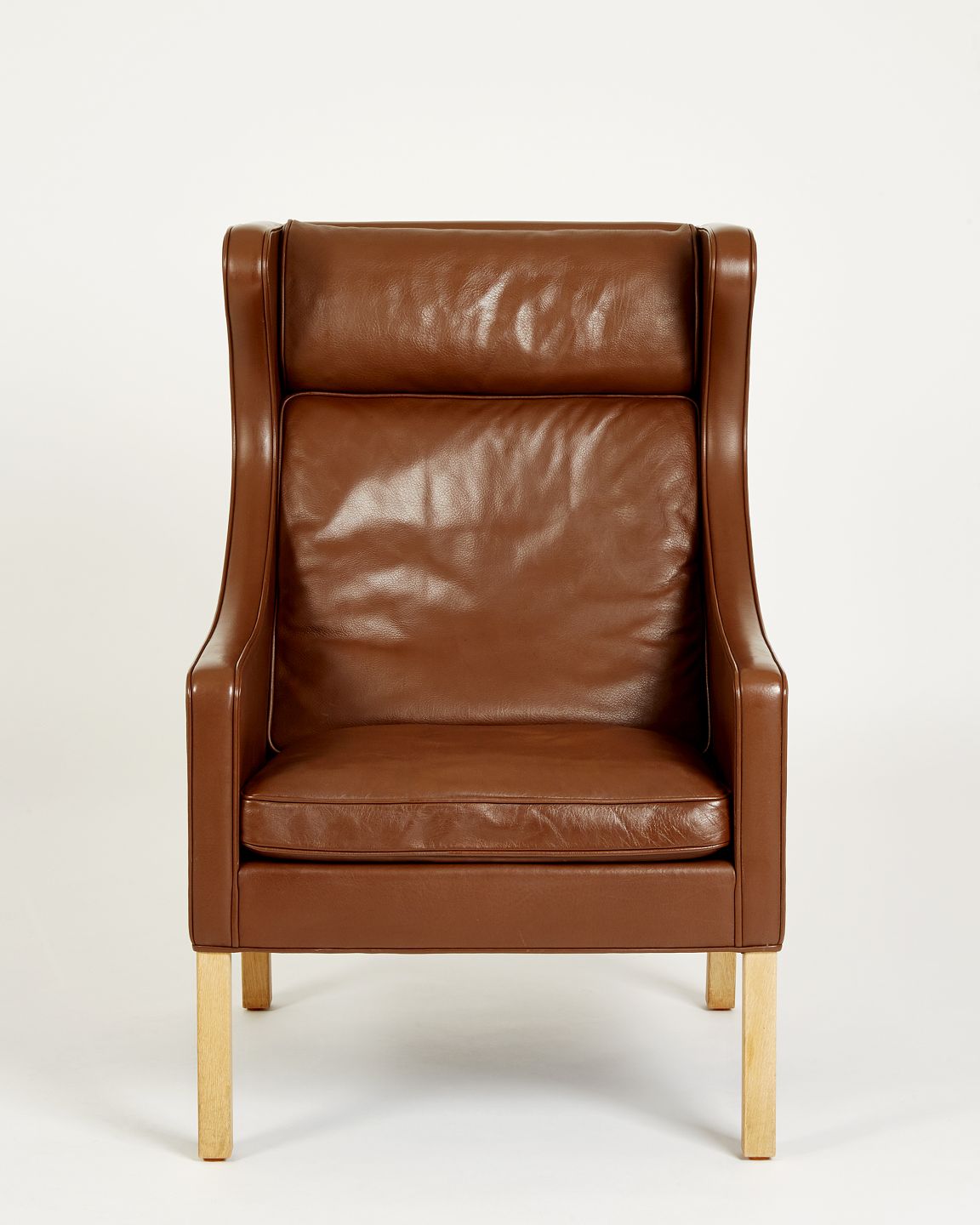 Øreklapstol med ben af lyst egetræ.Hynder med dunfyld og med originalt betræk i brunt læder. Velholdt stand med brugsspor.