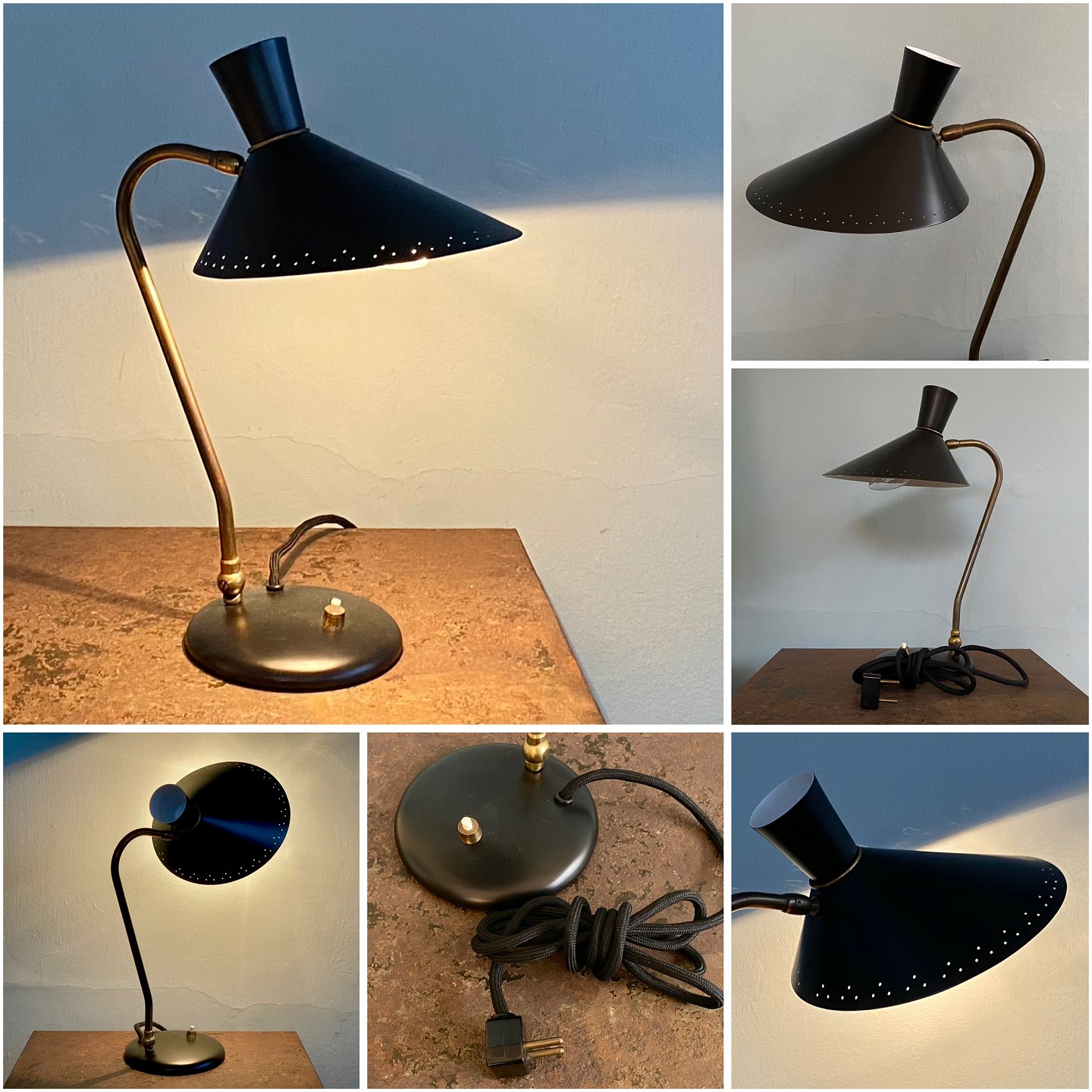 Table lamp from the 50'ties in black lacquered metal and brass. On the base there is a switch and a black fabric cord. Adjustable arm and gooseneck. Breakthrough screen.