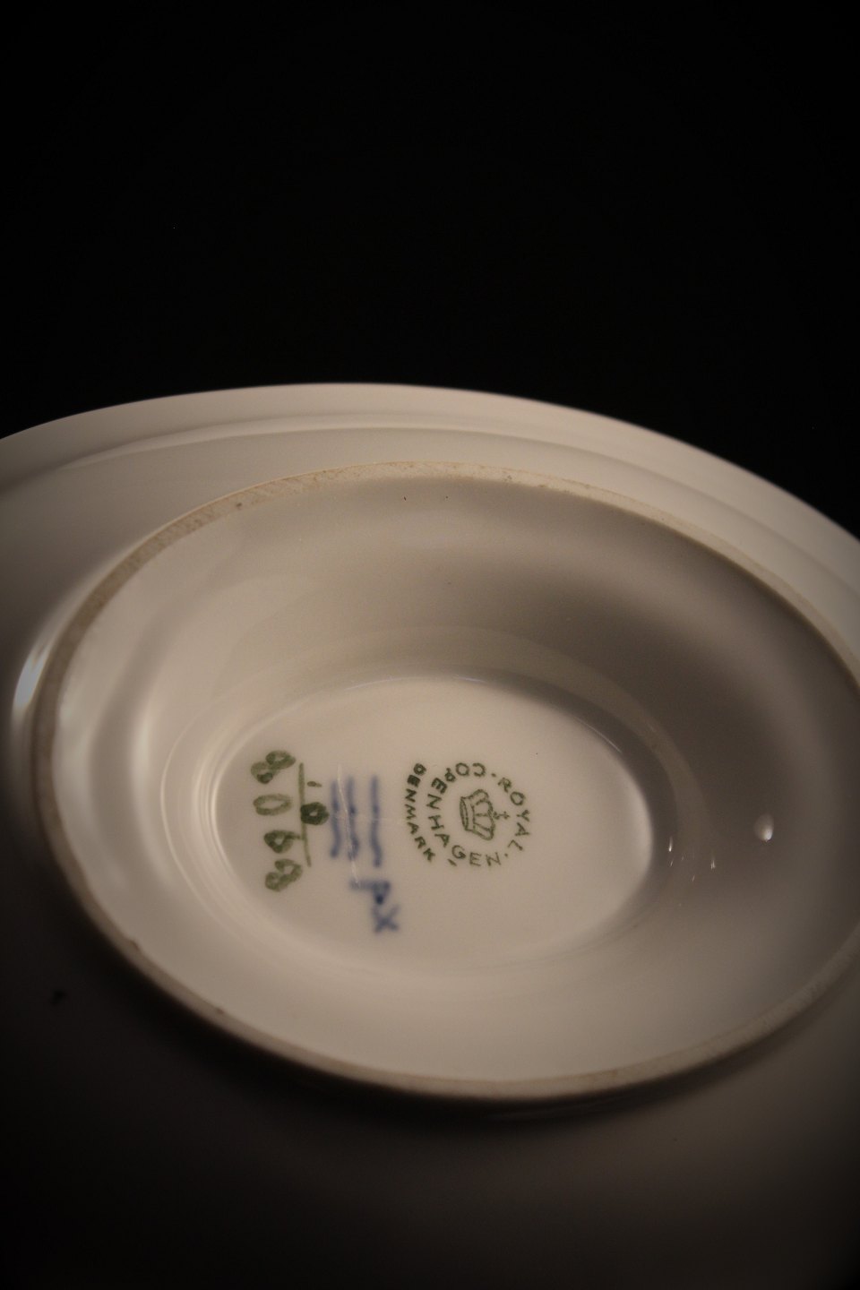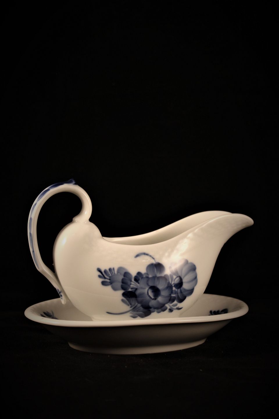 Blå Blomst sovsekande på fast fad fra Royal Copenhagen. ( flettet ) 2.sort. dekorations nummer : 10/8068. H:12cm. 19x12,5cm. Emne nummer: 10/8068