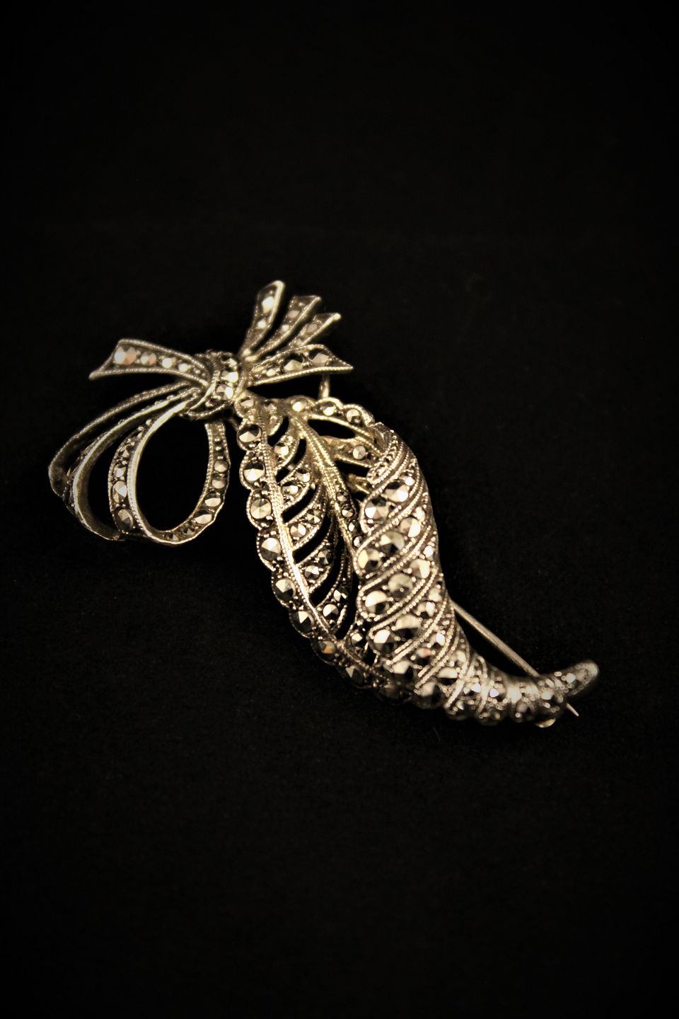 Old brooch in silver with lots of small shiny magasites. Measures: 5.5x3cm. Item number: smykke 135