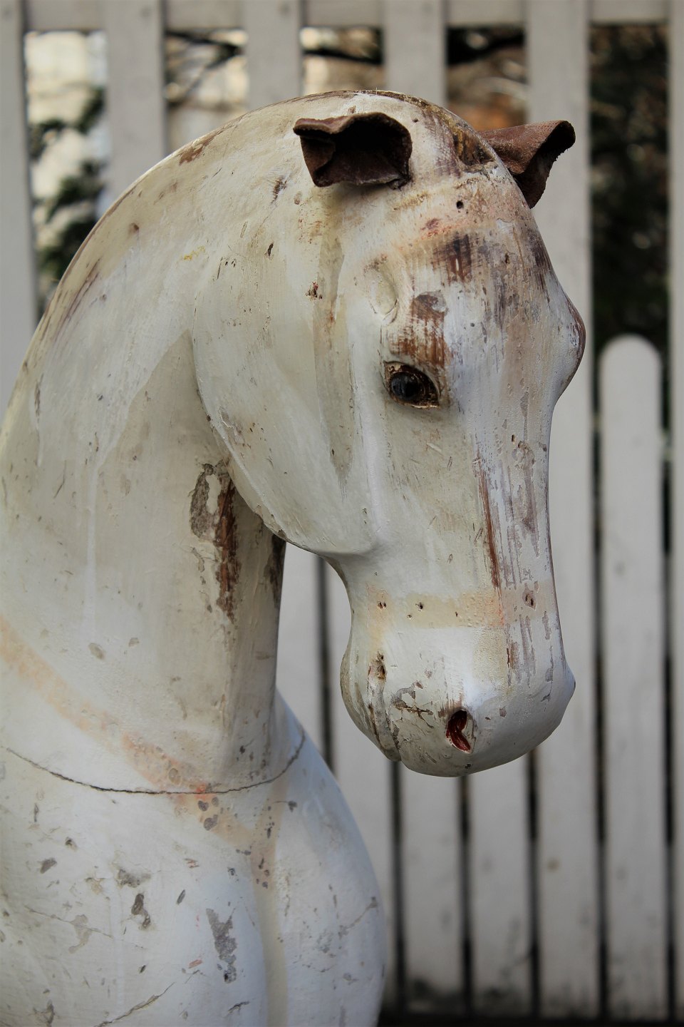 The horse has glass eyes, leather ear, tail in horse hair and stands in white original color with fine patina.