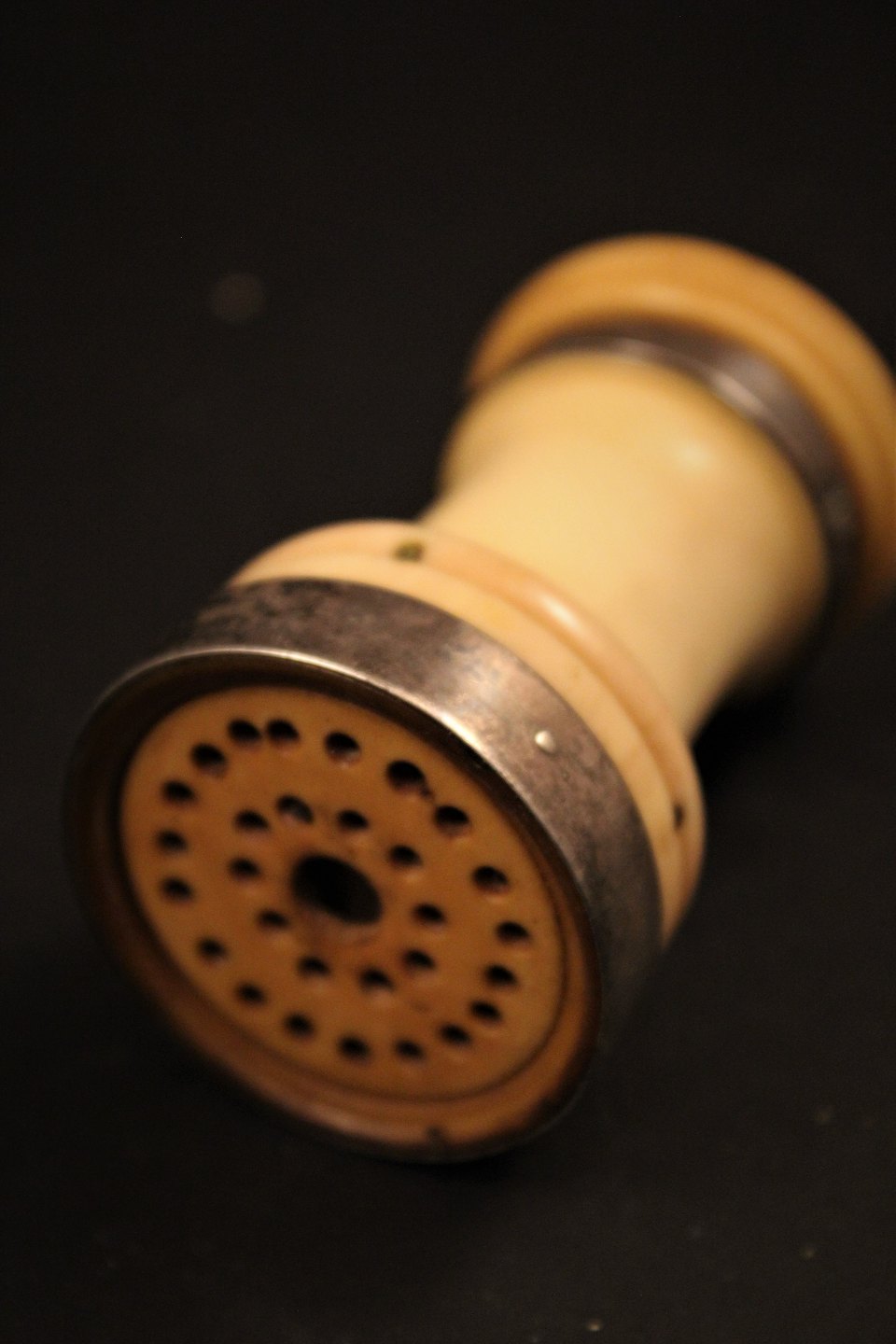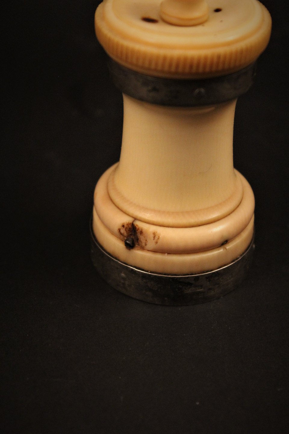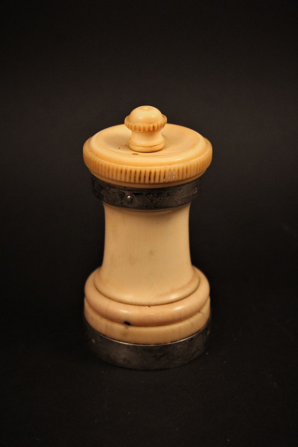 Old pepper mill made in ivory with silver border, stamped, as well as with a fine old patina. Height: 8,7cm.