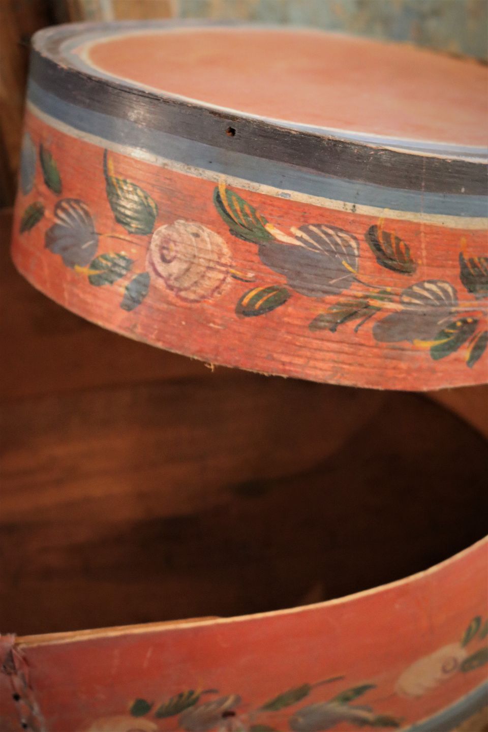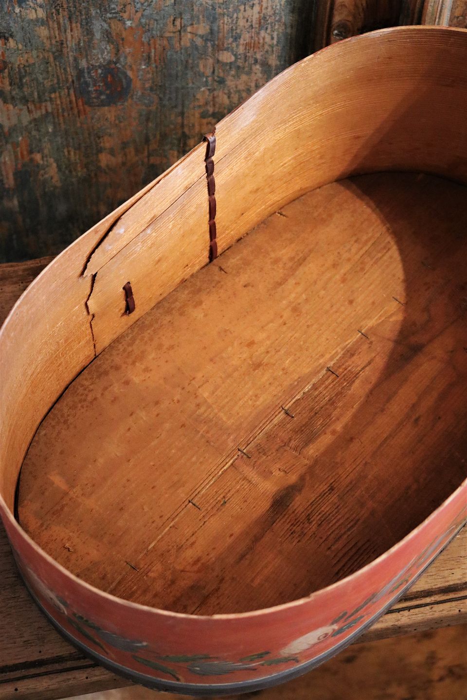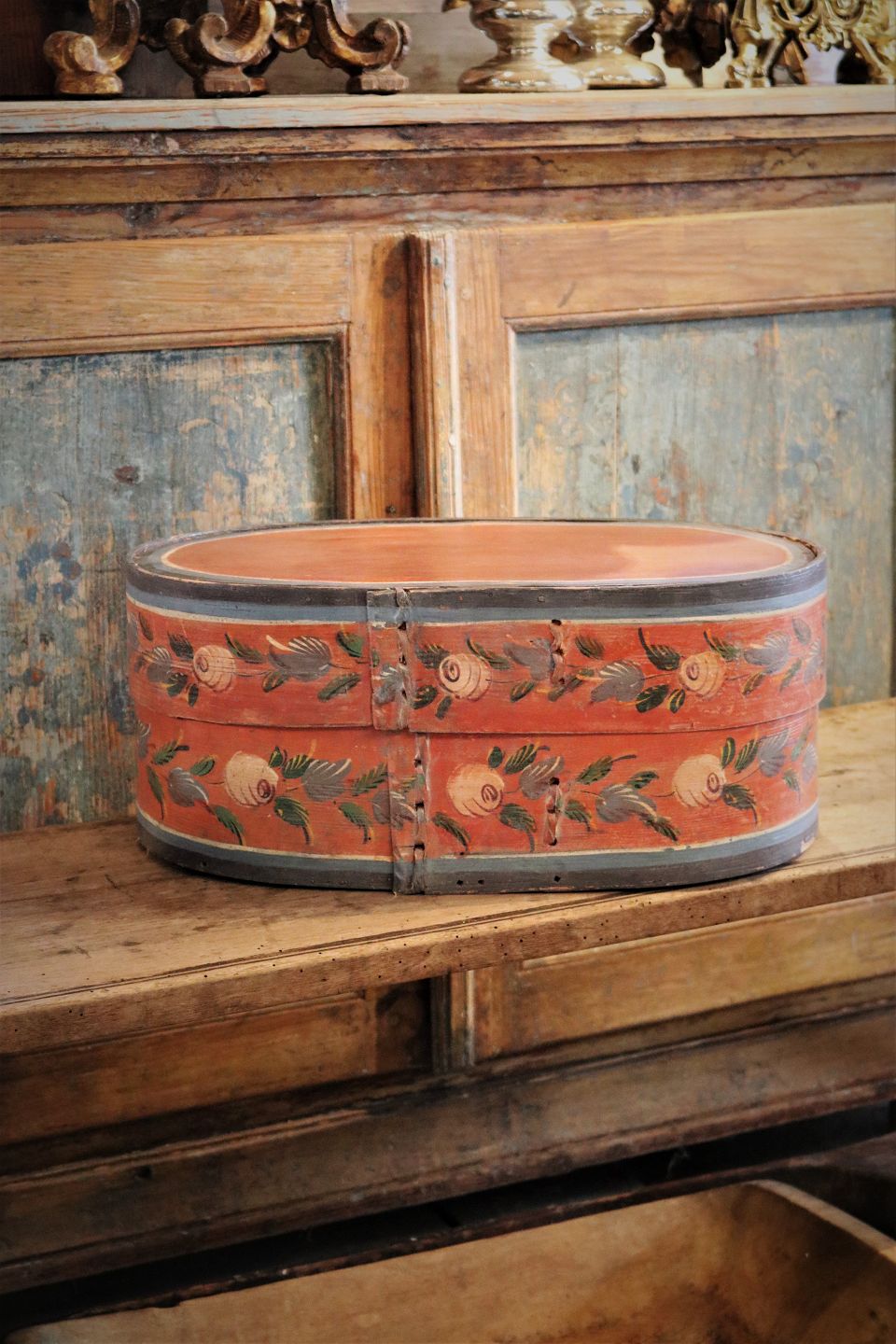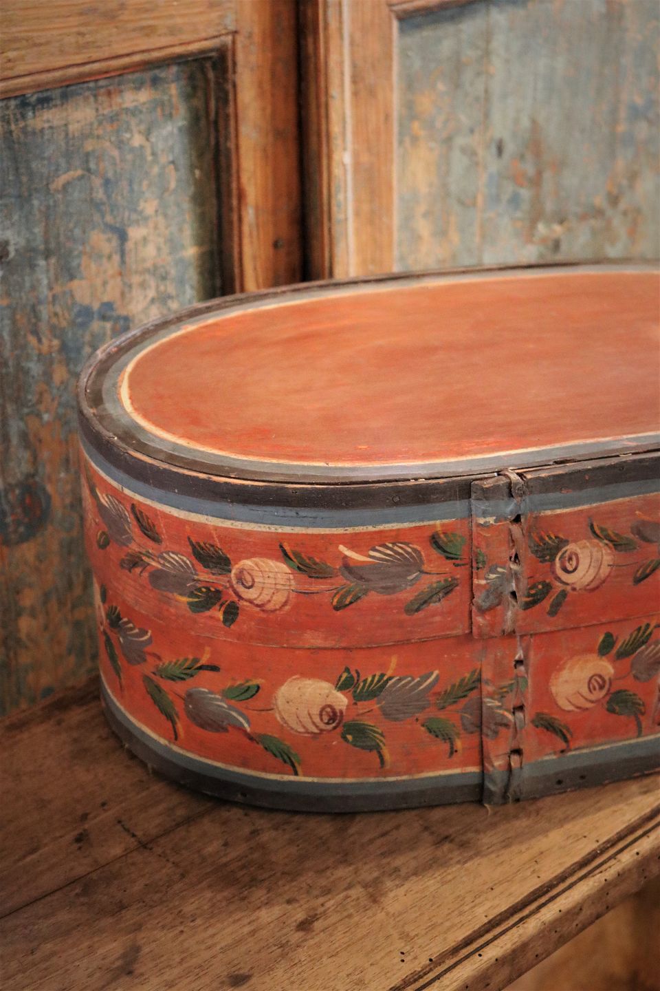 Svensk 1800 tals oval træ æske med original bemaling med blomstermotiv og med en fin patina.
