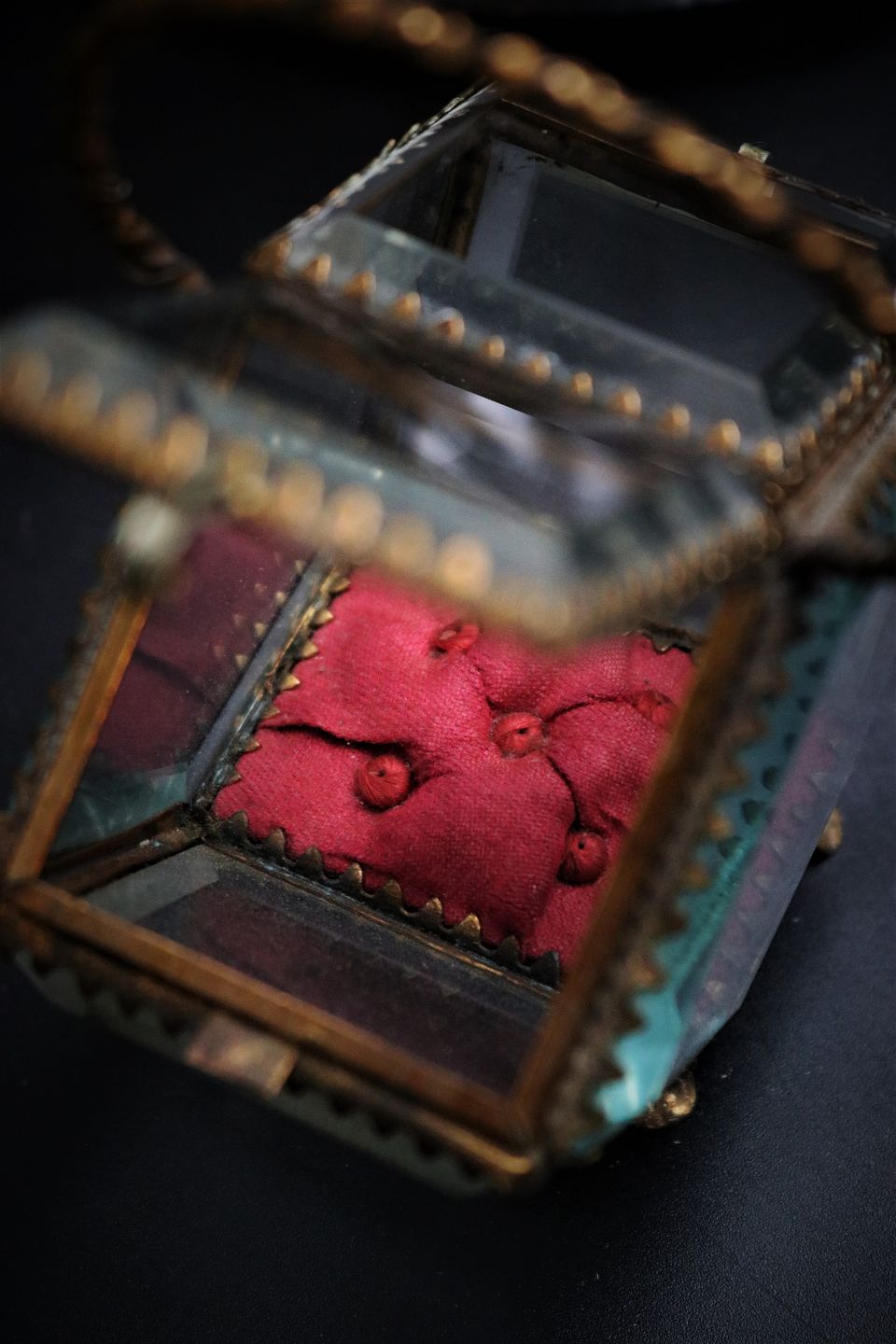 Old French jewelry box shaped like a basket in bronze and faceted glass with silk cushion and a nice old patina.