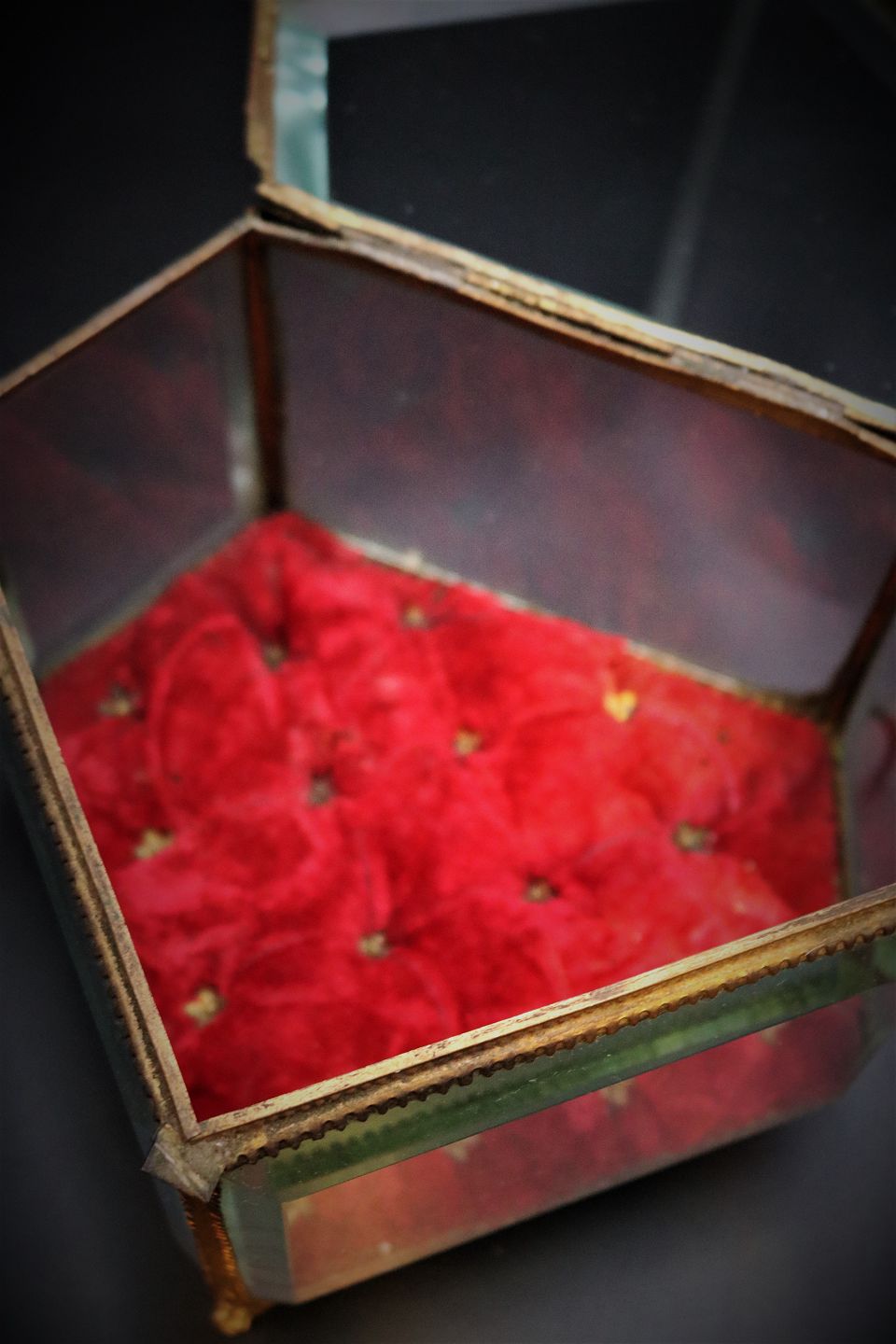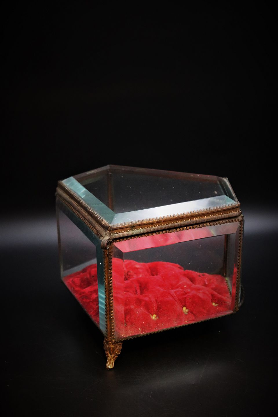 Stort 1800 tals fransk smykkeskrin i bronze , 5 kantet med facetslebne glas , velourpude i bunden og med en fin gammel patina.