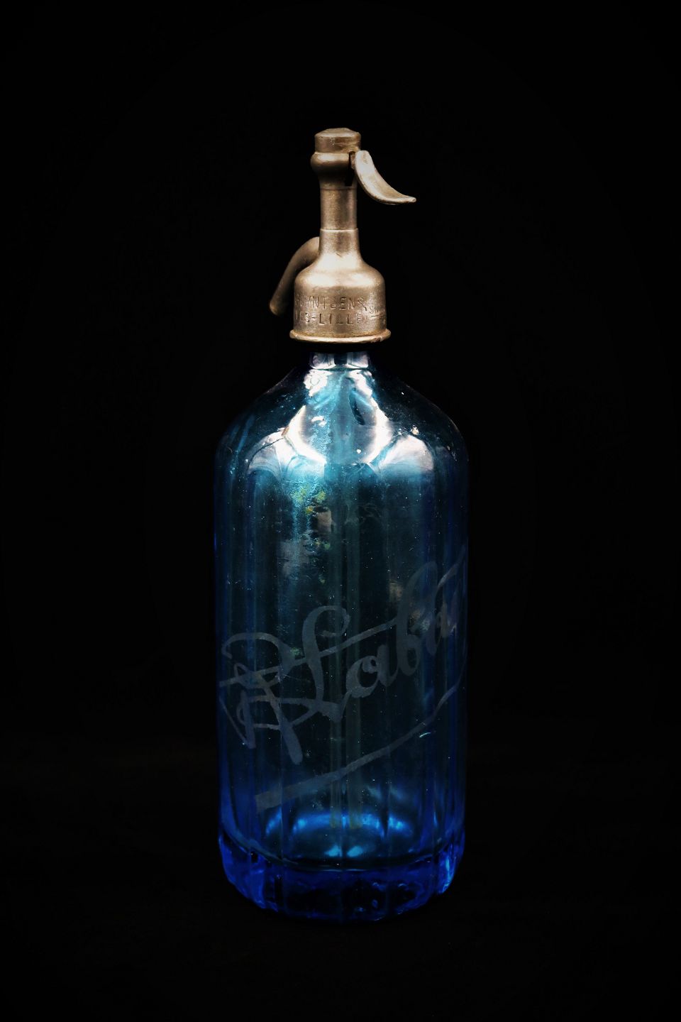 Dekorativ gammel fransk glas sifon i turkis blå farve fra gammel café med graveret skrift på siden af sifonen og lidt "Rå" patina.