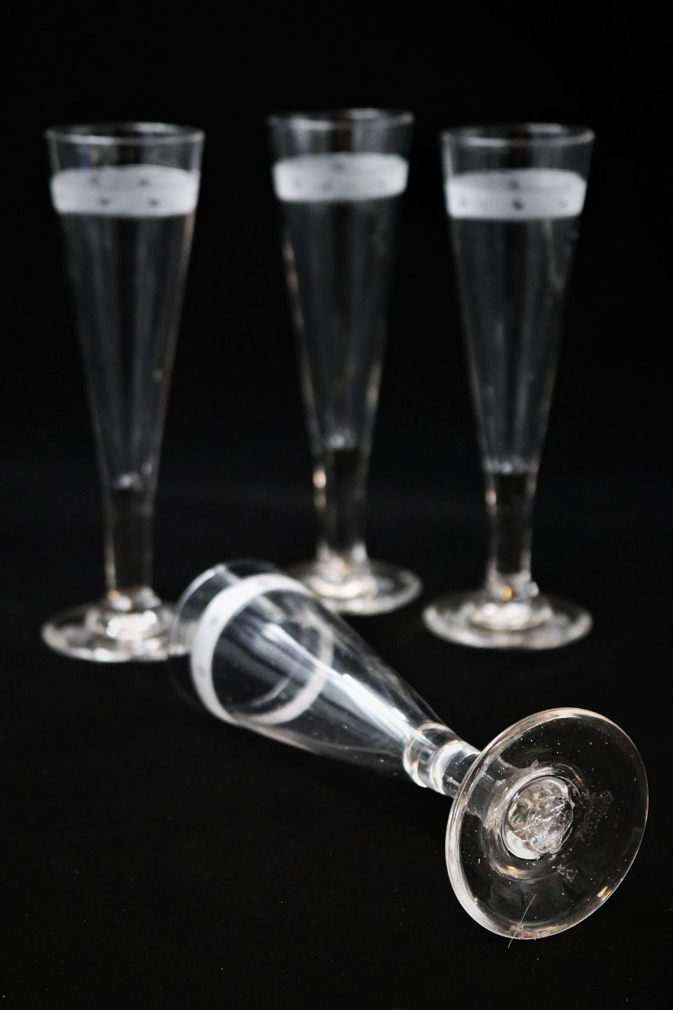 Fine, old mouth-blown champagne flute with fine decoration. H:16.5cm. Dia.:4.8cm. (3 pcs. in stock) Item number: Champagne fløjte nr. 21