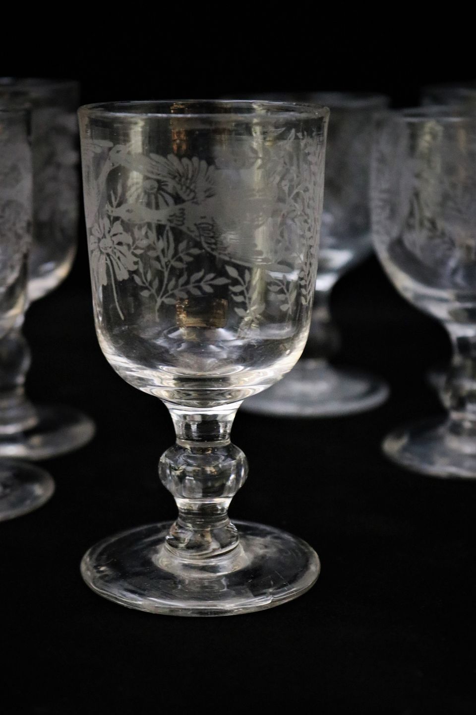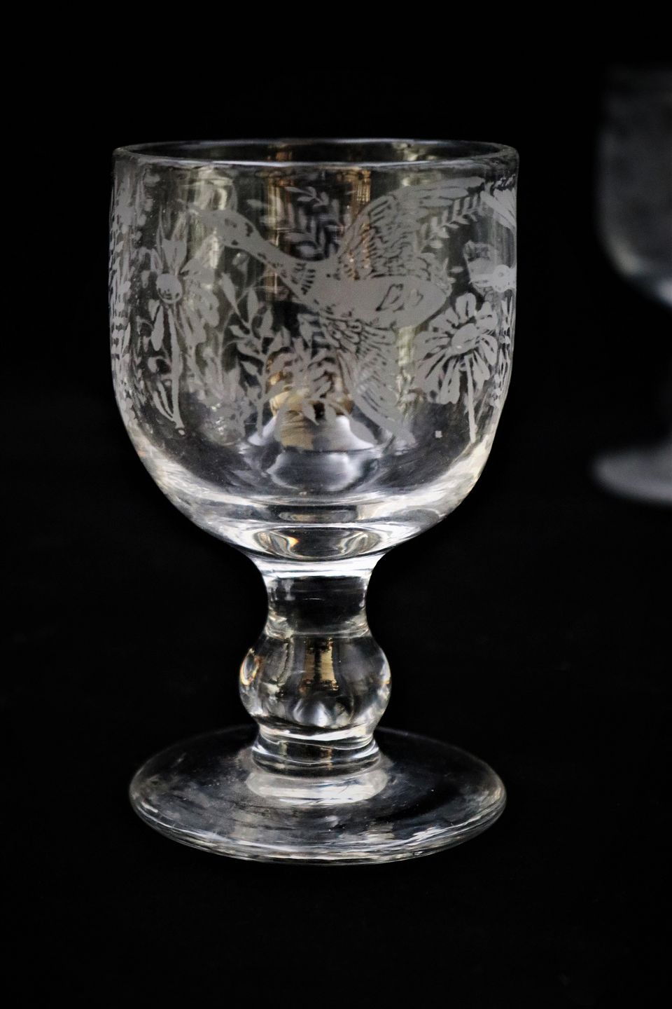 Gamle fransk mundblæste vinglas med slebet motiv af ænder og blomster. Højde: 12/13cm. Dia.:6,5cm.