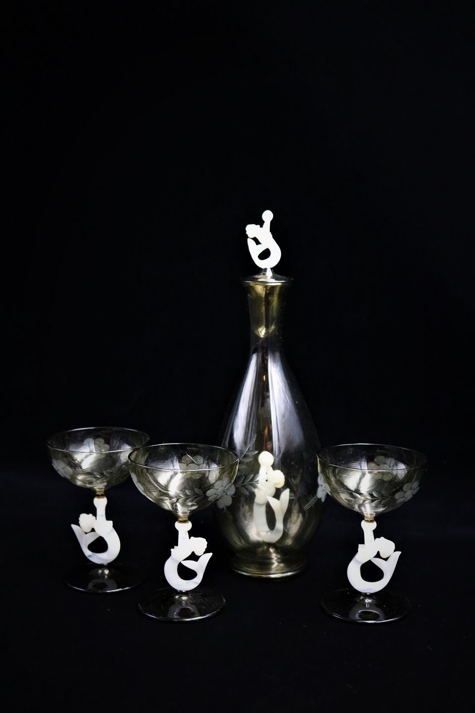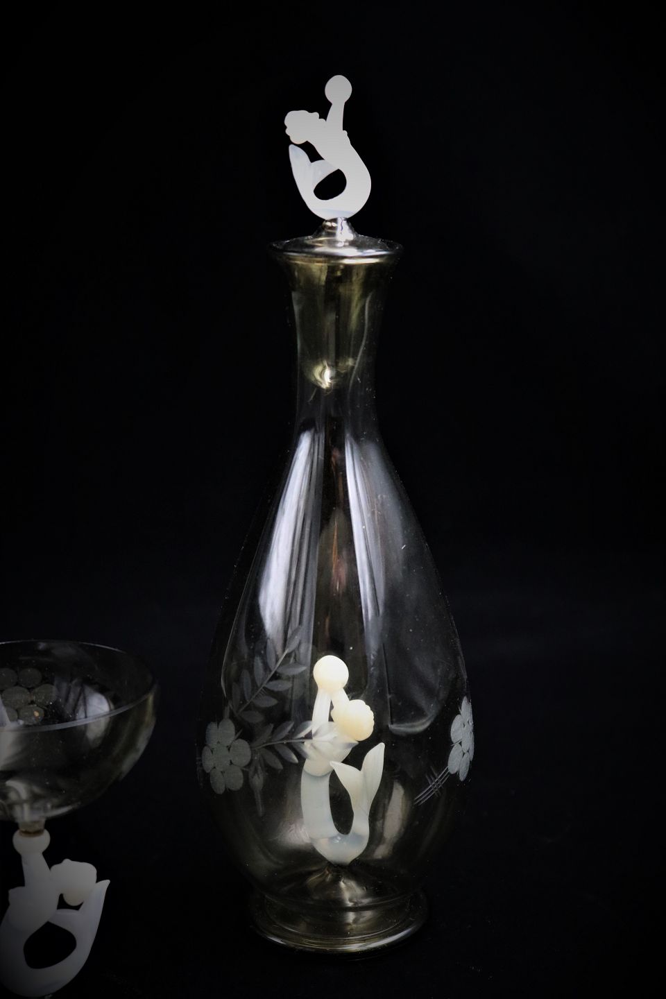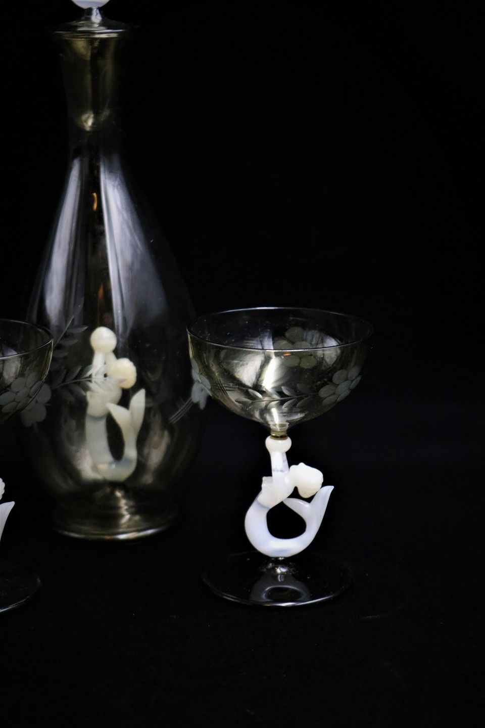 BIMINI LAUSCHA Art Deco liqueur crystal glass, 4 pcs. + carafe from 1920 in smoky glass with floral sandings and little mermaid carrying the glass itself.