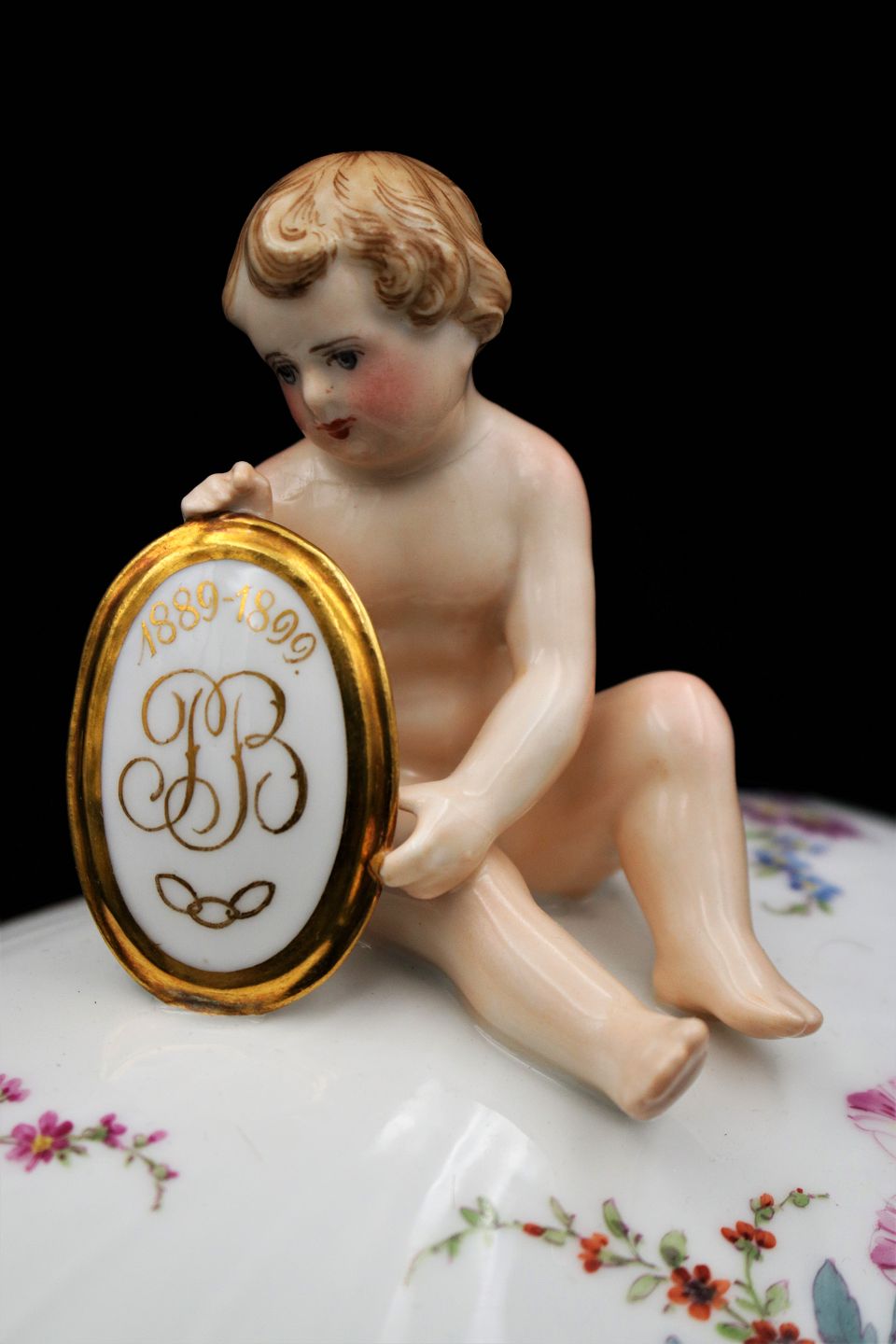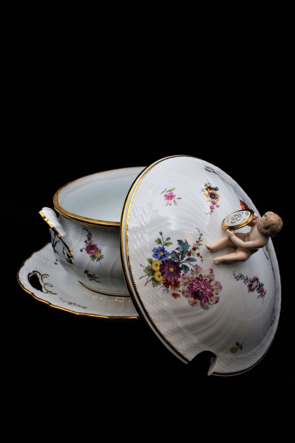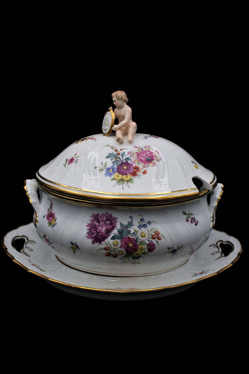 Antique Royal Copenhagen Full Saxon Flower Tureen with gold porcelain edges with saucer and small putty on the lid. (Initeler: FB 1889-1899)