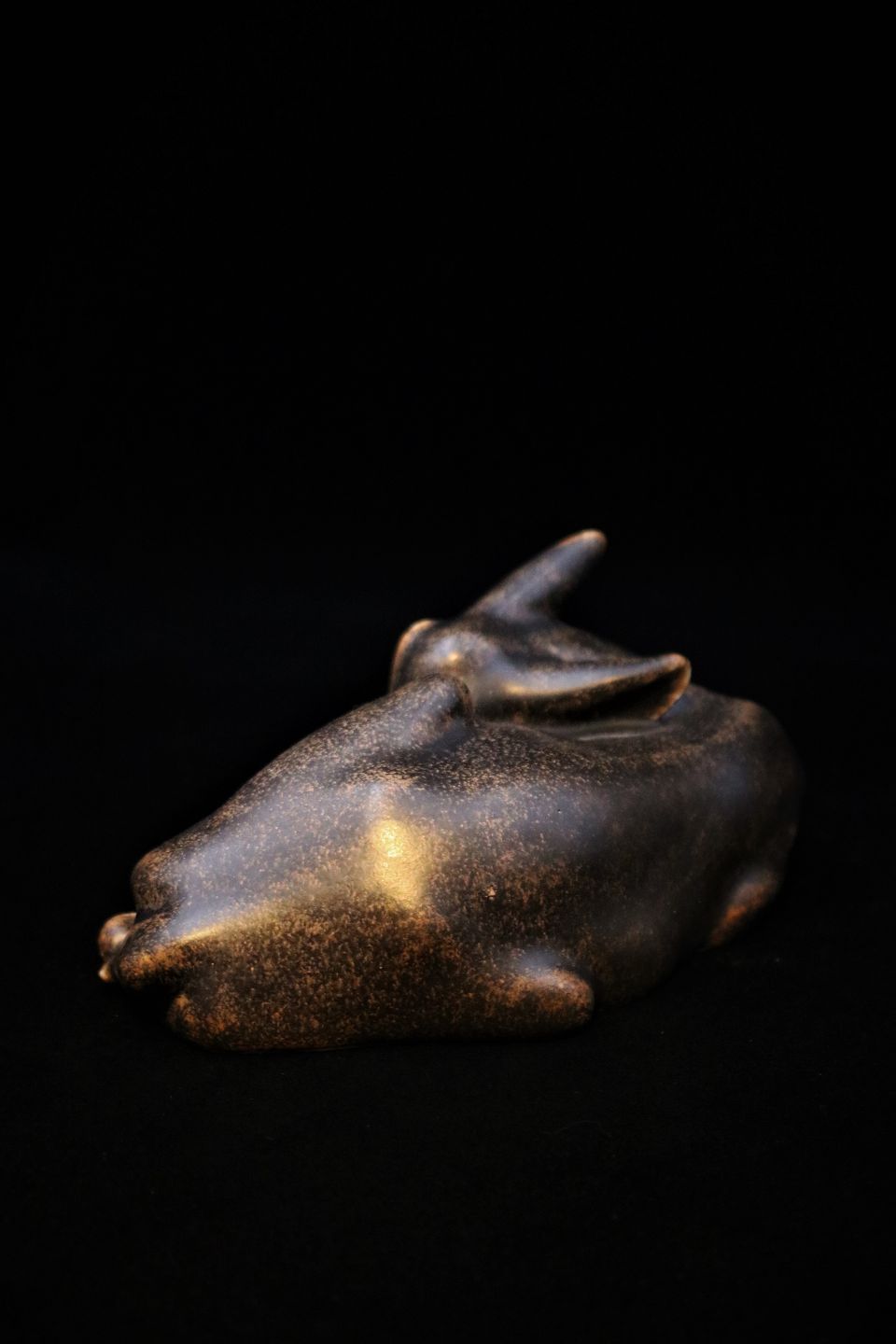 Saxbo ceramic figurine of a small lying fallow deer with fine brown glaze.
