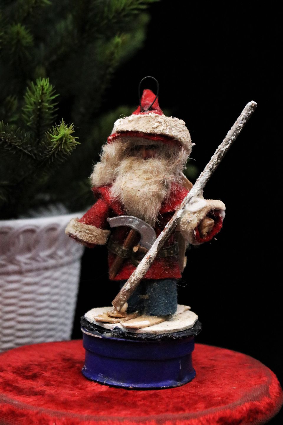 Gammelt juletræspynt , julemand på ski lavet af pap , vat og filt.