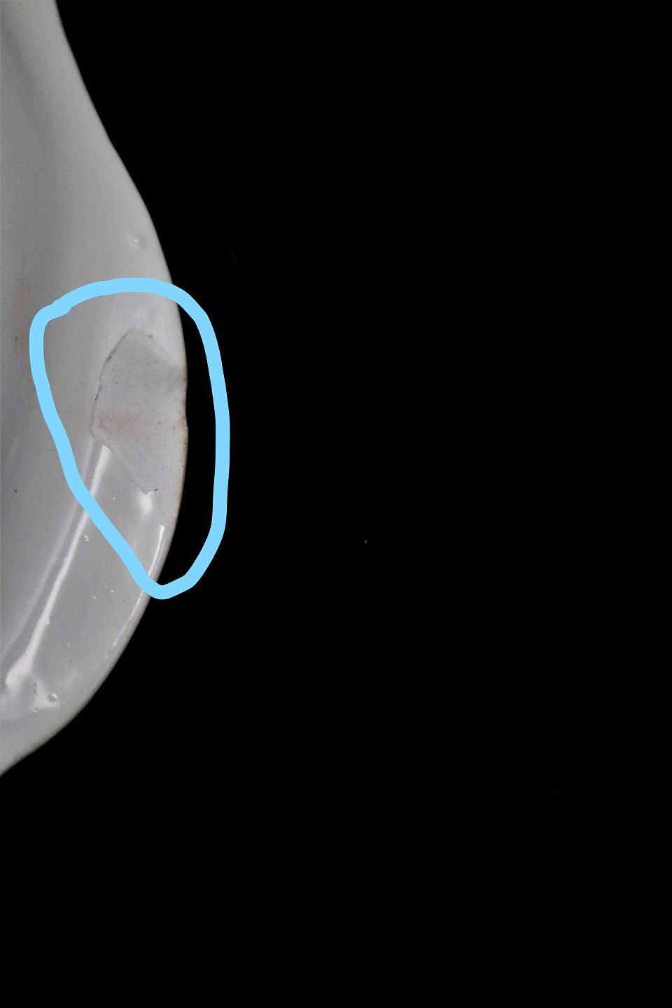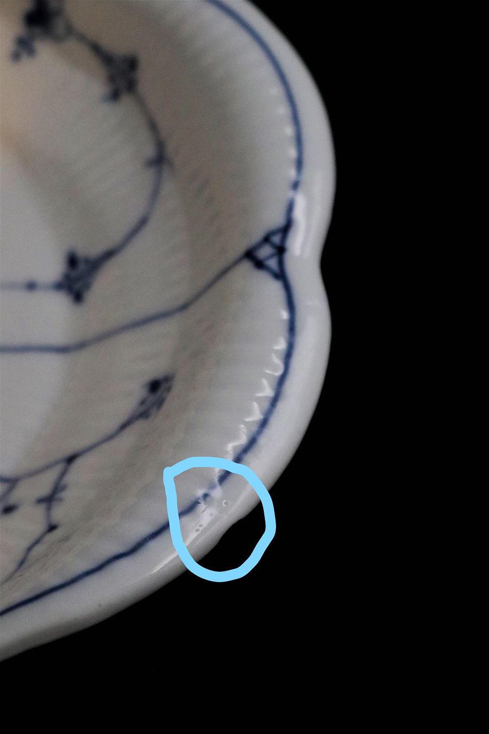 The dish has an edge chip on the underside of the edge and some glaze dots, but otherwise in fine condition.