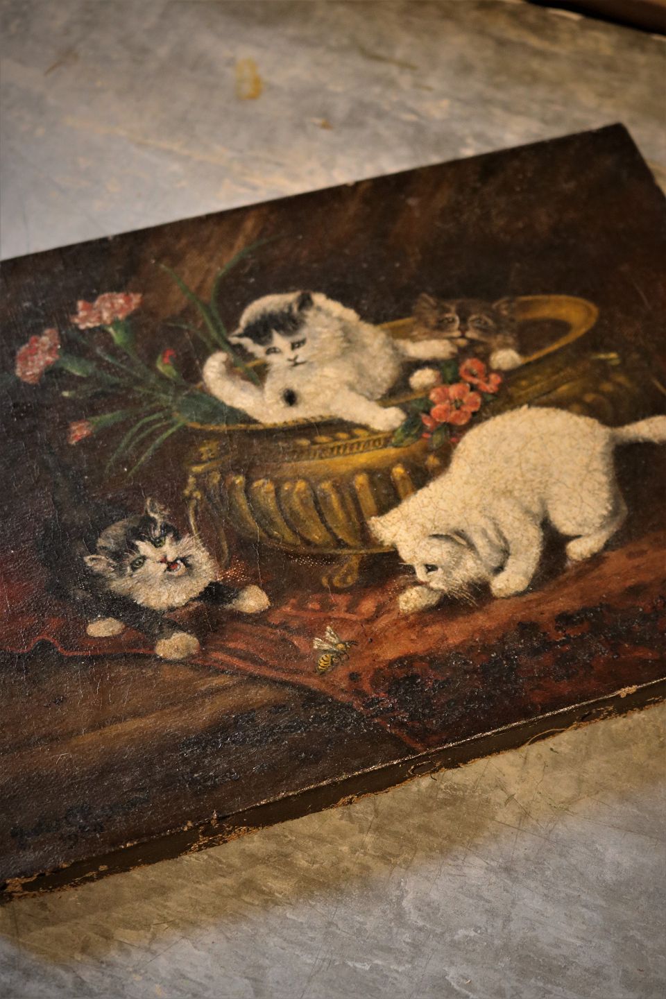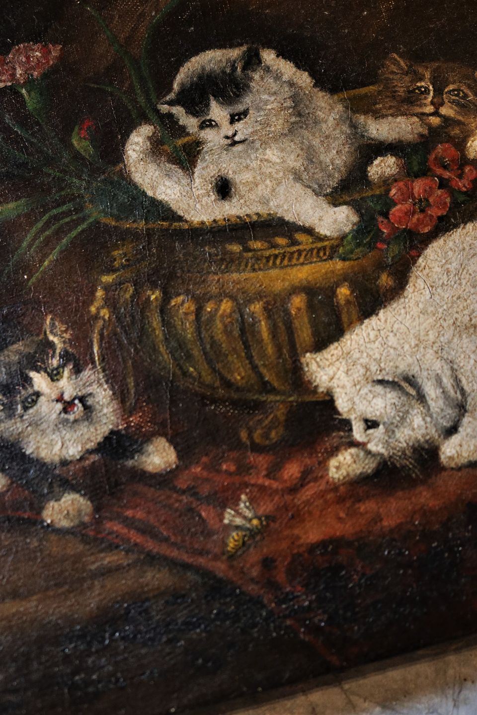 Olie maleri på lærred af 4 små kattekillinger som leger i en blomster krukke. Måler: 24x33cm. Signeret Jules Chamand 1930.