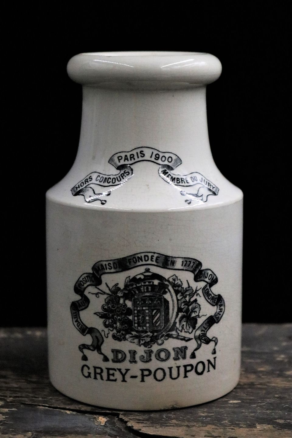 Decorative, old French faience mustard jar from "Dijon" in cream colored faience with black writing...