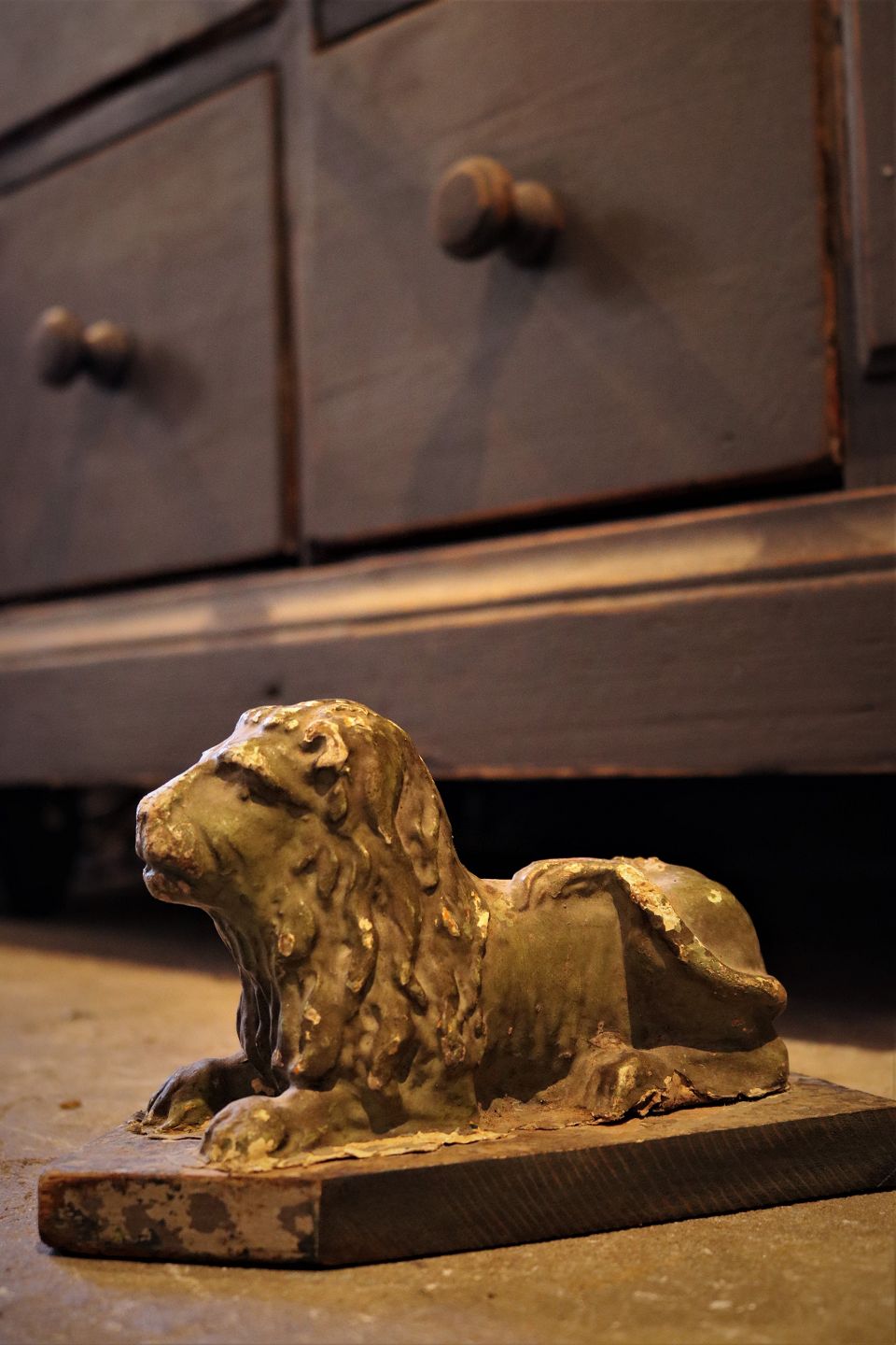 Dekorativ fransk 1800 tals løve i bemalet papmache , med en fin gammel patina , liggende på træbund. H:11cm. L:18cm. B:8cm.