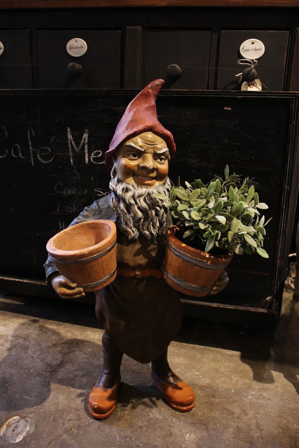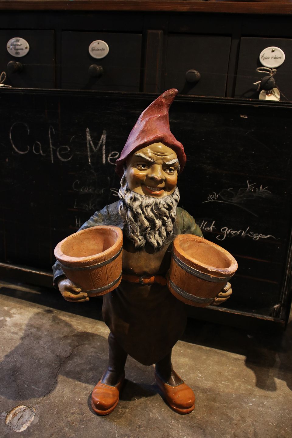 Fin , gammel julenisse fra 40érne i bemalet gips / kunstmasse med en rigtig fin patina. Nissen bære på 2 kurve hvor der kan sættes planter i.
