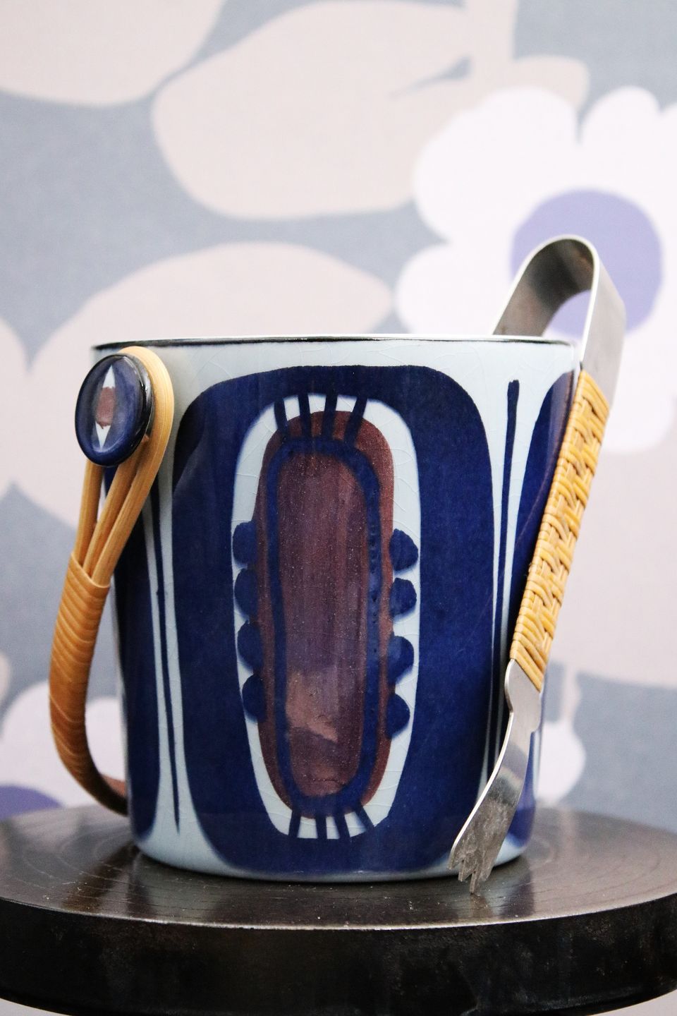 Old glazed earthenware ice bucket from Aluminia with braided handle and matching ice tongs.
